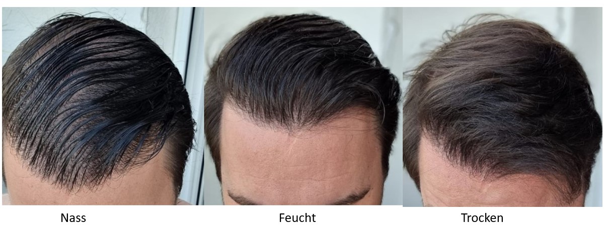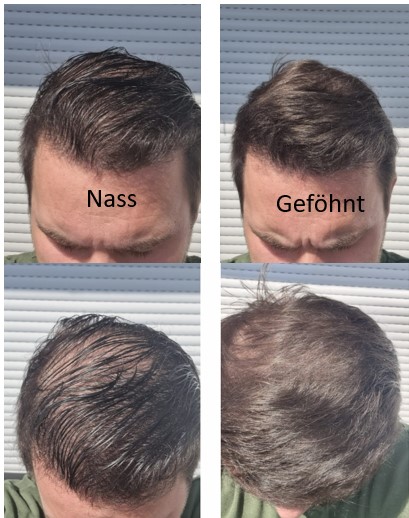 Hier mal ein Vergleich unter der Sonne im nassen und geföhnten Zustand.