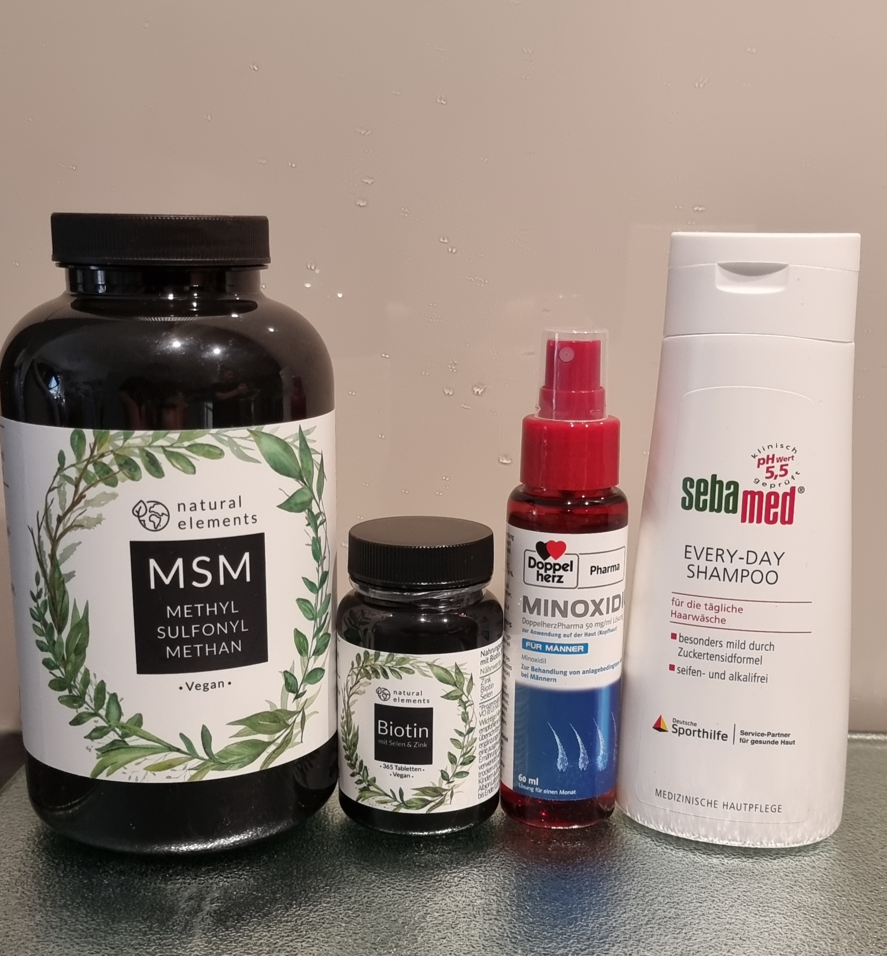 Meine tägl. Pflege besteht aus MSM, Biotin und Vitamin D und Minoxidil.