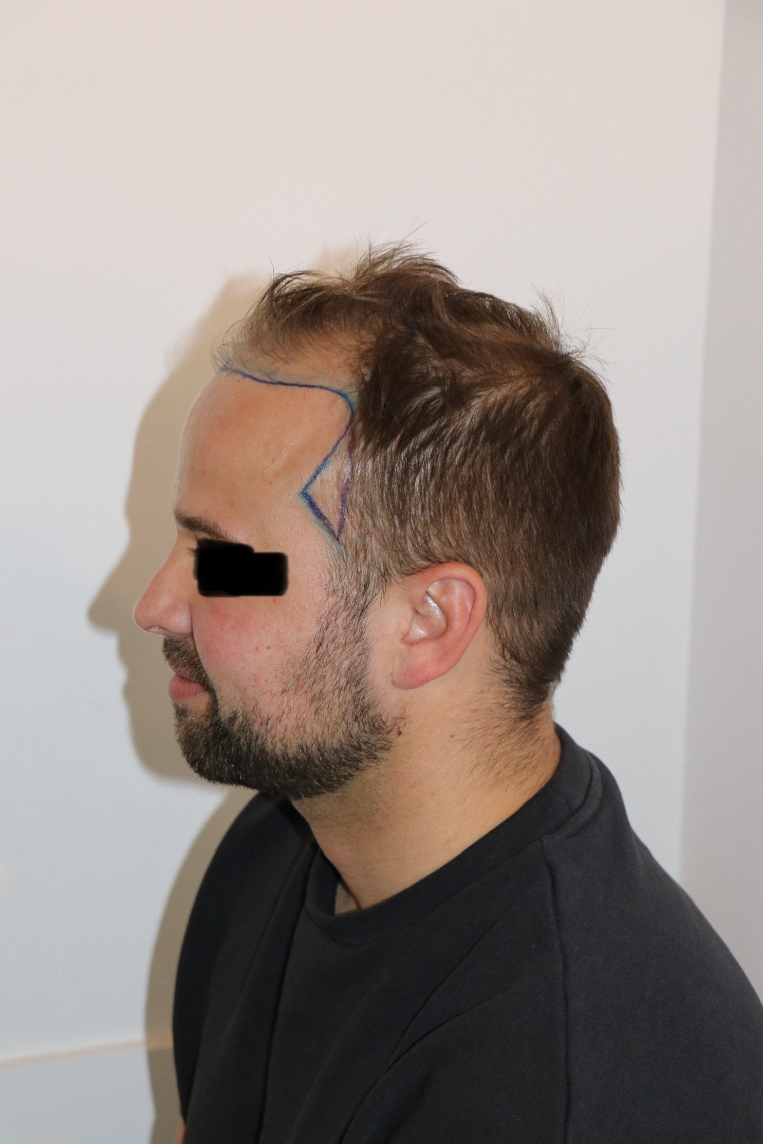 Nach kurzer Wartezeit wurde ich dann schon von ihm in Empfang genommen. Wir gingen nochmal alle Schritte zusammen durch , er untersuchte nochmals meine Haare, auch die vom hinteren Kopfbereich (Tonsur). Dabei stellte er begeistert fest, dass die Haare im genannten Bereich wieder schön kräftig geworden sind aufgrund der Nutzung des Finagels. Er machte Bilder und verglich diese mit den Bildern vom Beratungsgespräch von 2020. Dann zeichnete er mir die Haarlinie ein, zunächst mit einer Schablone und anschließend mit einem „Lasergerät“, um möglichst alles ganz genau zu zeichnen. Mir war es wichtig , die Haarlinie nicht zu konservativ, aber auch nicht zu aggressiv zu zeichnen. Er erklärte mir, dass es 3 Arten von Haarlinien gibt: Die konservative, normale und die aggressive. Er zeigte mir dies, indem er mir alle drei Linien zum besser veranschaulichen auf meine Stirn zeichnete. Wir einigten uns auf die „normale“ Linie. Um am nächsten Morgen nicht unnötig Zeit zu verlieren, gab er mir für den Abend ne Bandana mit, damit ich meinen gezeichneten Kopf verdecken konnte 😄 das Gespräch ging mehr als eine Stunde, man merkte einfach , dass er mit Leidenschaft seine Berufung ausübt. Obwohl meine Vorfreude auf die bevorstehende Op groß war, hatte ich dennoch großen Respekt davor.
