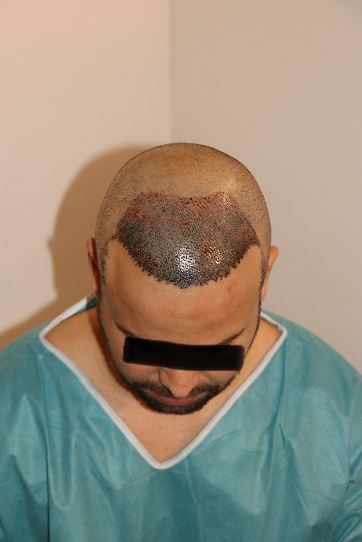 Nachdem ich vom Taxifahrer in die Klinik gebracht wurde, wurde ich sofort „mit offenen Armen“ von den freundlichen Mitarbeitern der Klinik empfangen. Mir wurde mein für den Tag privates Patientenzimmer gezeigt, bestellte mein Mittagessen und zog mir die Op-Kleidung über. Nach kurzer Zeit holte mich Dr. Feriduni ab und begleitete mich in den Op-Raum, wo bereits seine Mitarbeiterinnen auf mich warteten. Nachdem alle Vorbereitungen ( Haare rasieren, Zugang legen, Einzeichnen des Spenderbereichs, etc..) für die Op getroffen wurden, legte ich mich in Bauchlage auf die Op-Liege. Dr. Feriduni setzte die Betäubungsspritzen in den Hinterkopf. Während er dies tat, nutzte er parallel noch ein Vibrationsgerät, welches die Nerven ablenkte. Ich war positiv überrascht, dass die Spritzen nur kleine Pickser waren, es war alles sehr gut auszuhalten (schmerzarm) !