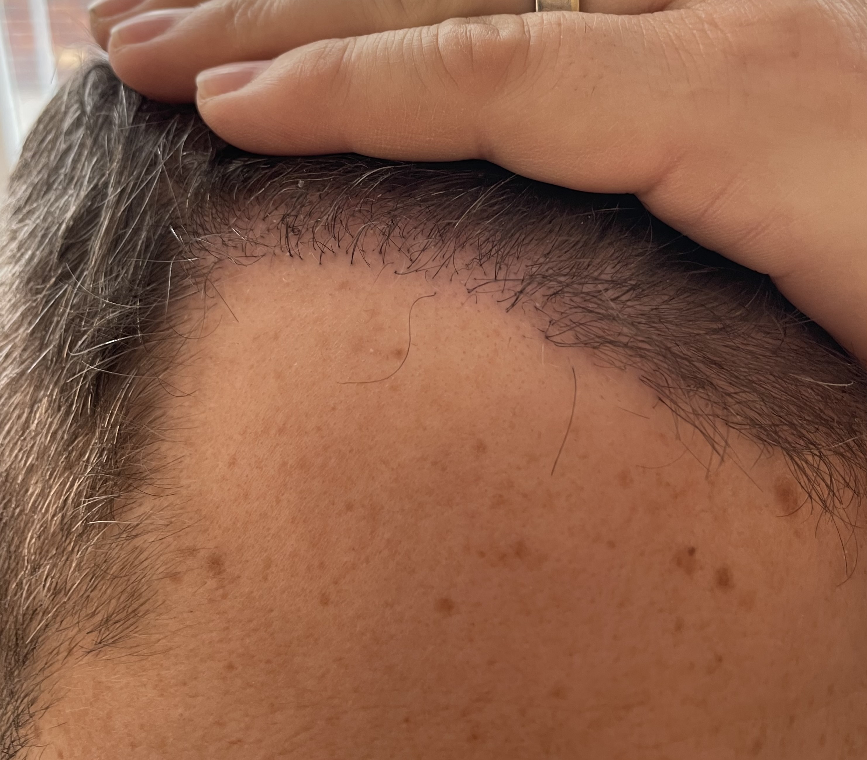 Geheimratsecken auffüllen, Tonsur auffülen, ausdünnende Front verdichten, und ausdünnenden Oberkopf verdichten.