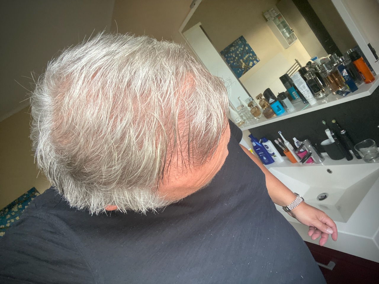 Hier das Foto nach dem Friseurbesuch, wo man die fehlende Dichte besser erkennt in der Ansicht von oben.