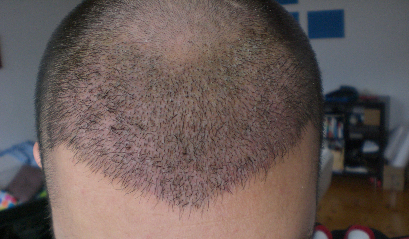Die Rötung wird bald weg sein...man sieht hinten, dass die Wunden geheilt sind. Vorne natürlich auch. Einzige Kakophonie sind die Grafts von der ersten HT, werden aber nach der Fülle nicht mehr auffallen. Dabei wird wahrscheinlich eine Fach-Laser-Behandlung in der Zukunft helfen können...