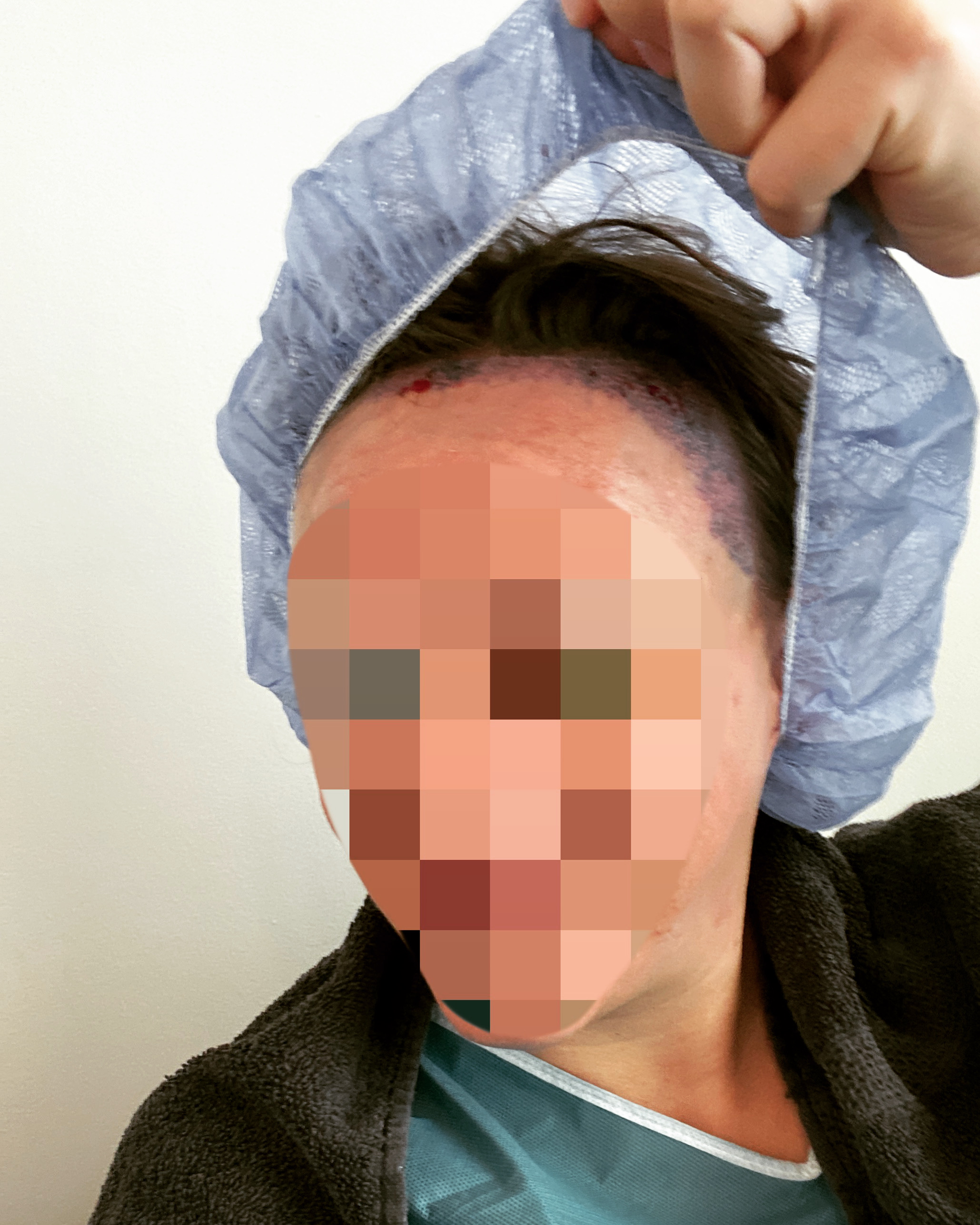 Im ersten Teil der OP wurden meine Stirn vorbereitet. Dr. Feriduni hat über 2.000 kleine Schlitze gesetzt, in die nachher die FU‘s gesetzt wurden. Um dies besser sichtbar zu machen, wurden diese blau eingefärbt (siehe Foto). Danach wurden Teile meines Hinterkopfes rasiert und die Entnahme fand statt. Ich war dabei so entspannt, dass ich sogar zwischendurch geschlafen habe.