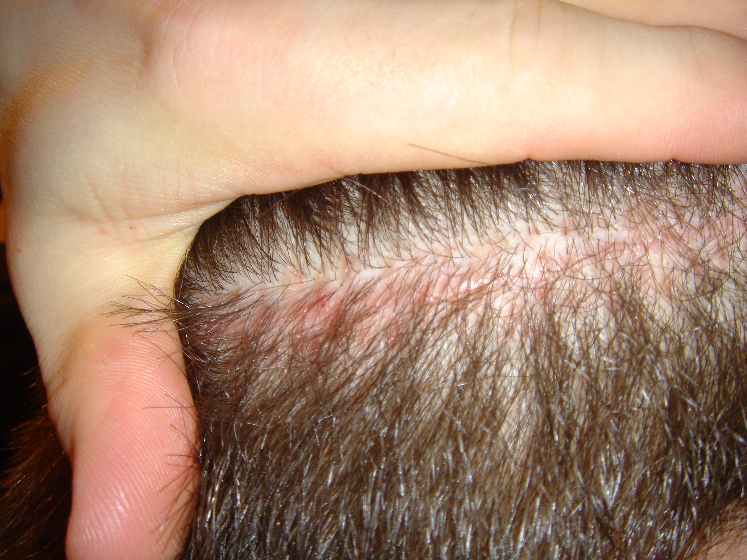 Zu der Narbe; sie ist zwar noch ziemlich Rot, aber sehr dünn und es wachsen bereits Haare durch, wodurch auch ein Paar Pickel entstehen. An 5 Stellen hat Rahal zum zuziehen der Hautlappen mehrmals drumherumgenäht, also den Faden öffter duch ein Loch gezogen, wodurch an diesen Stellen noch kleine 2*3-4 mm kahle Stellen zu sehen sind, doch dort wachsen bereits Haare nach. Der Shockloss um die Narbe war sehr gering und im Empfangsbereich nicht erkennbar.