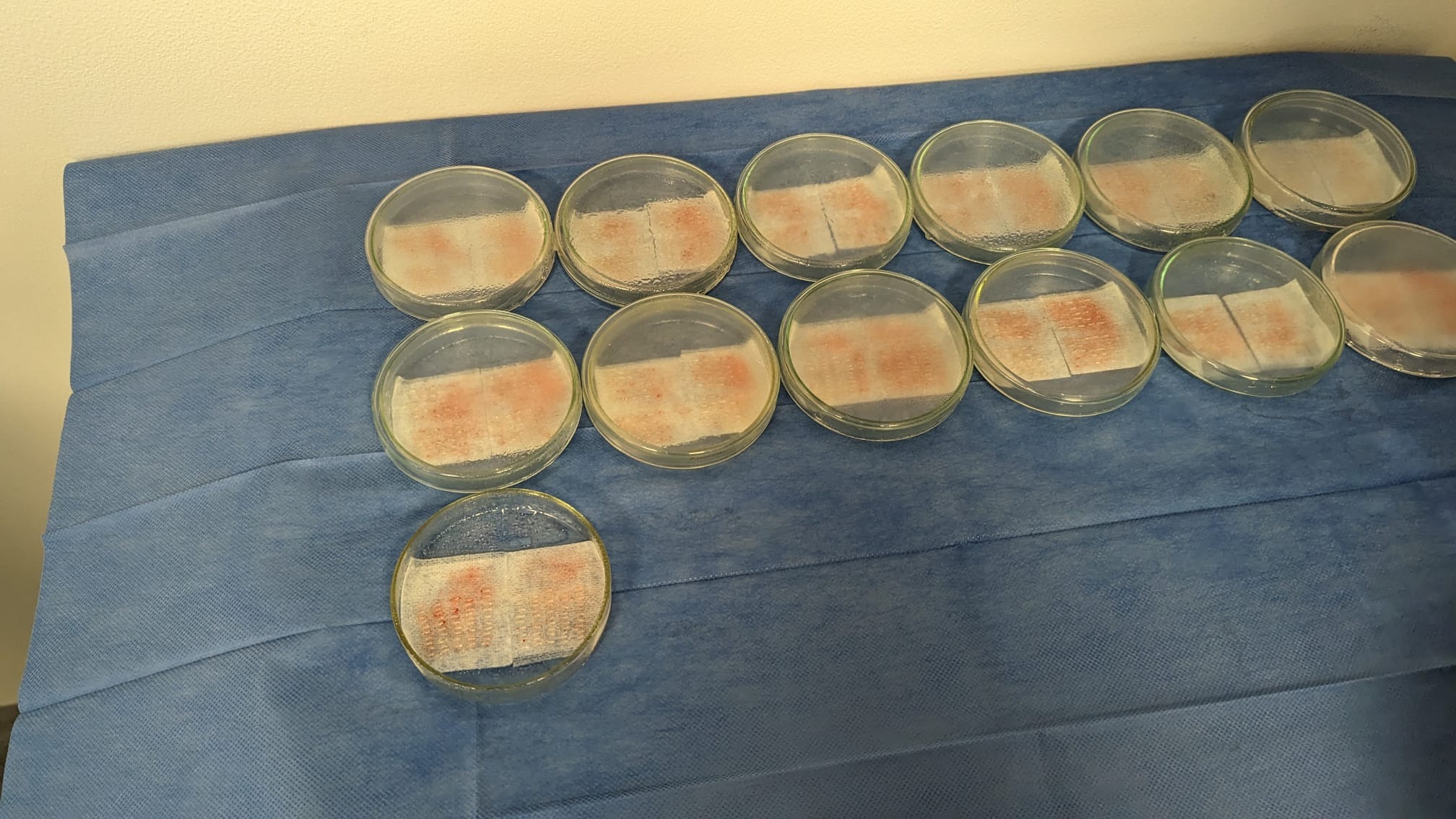 2. Zwei Helferinnen (alle super professionell, aber ich lasse die Namen mal anonym) bohren kleine Mini-Haarbüschel (1 bis 4 Haare in jedem Graft) aus dem Spende-Bereich und eine Horde von weiteren Helferinnen sortiert diese und legt sie in eine Vitaminlösung und auf Eis. Dauerte so anderthalb bis zwei Stunden vielleicht. Die Entnahme ist relativ zufällig verteilt, damit es danach möglichst wenig auffällt dass Haare im Spenderbereich fehlen.