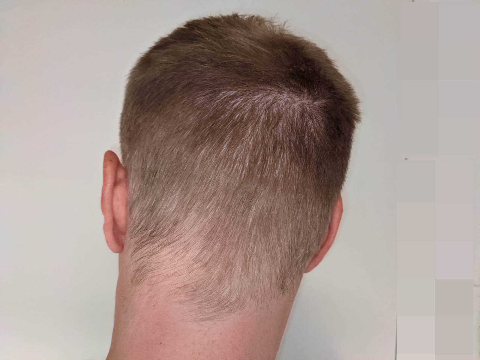 2 - Die kahle Stelle wurde dann etwas weiter rasiert als sie eigentlich groß ist. Die Idee dabei ist, dass der Übergang zu den bestehenden Haaren besser wird. Ich hab gefragt ob alles rasiert werden muss oder nur Spender- und Empfängerbereich. Und es war kein Problem, das zu begrenzen. Sieht natürlich ein bisschen lustig aus aber meine Idee ist, dass ich schnell wieder im Homeoffice arbeiten kann, weil die Kamera direkt von vorne dann ja nur die kurzen Seiten sieht und sonst frontal alles relativ normal wirkt.