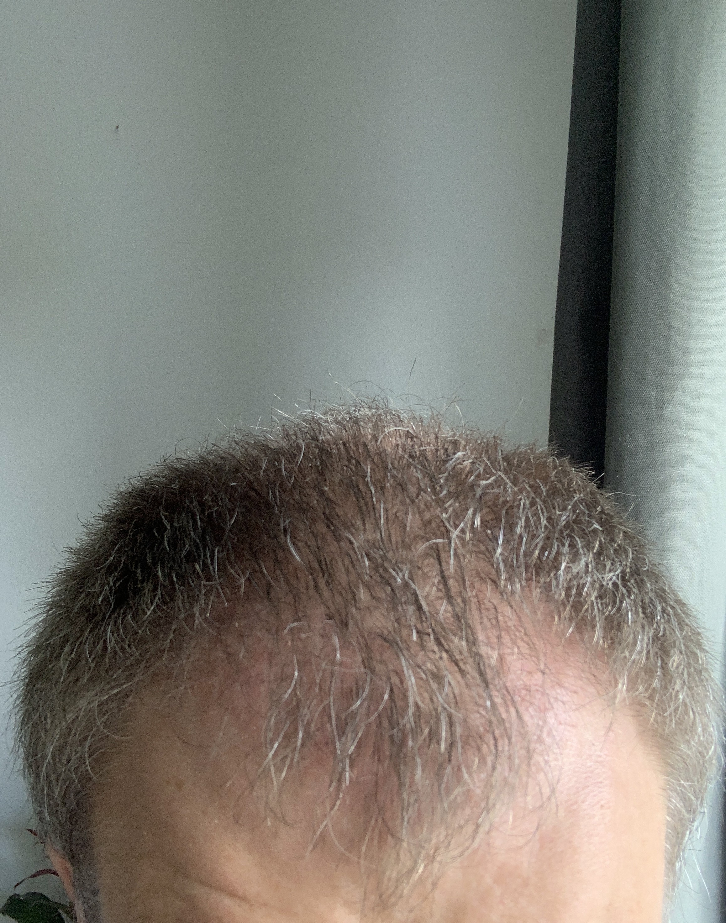 Es sind jetzt noch keine großen Ergebnisse sichtbar, ein paar feinere Härchen sind in der linken Geheimratsecke gewachsen und beim massieren des Oberkopfes merke ich zumindest auch auf der Tonsur kleine Stoppel.