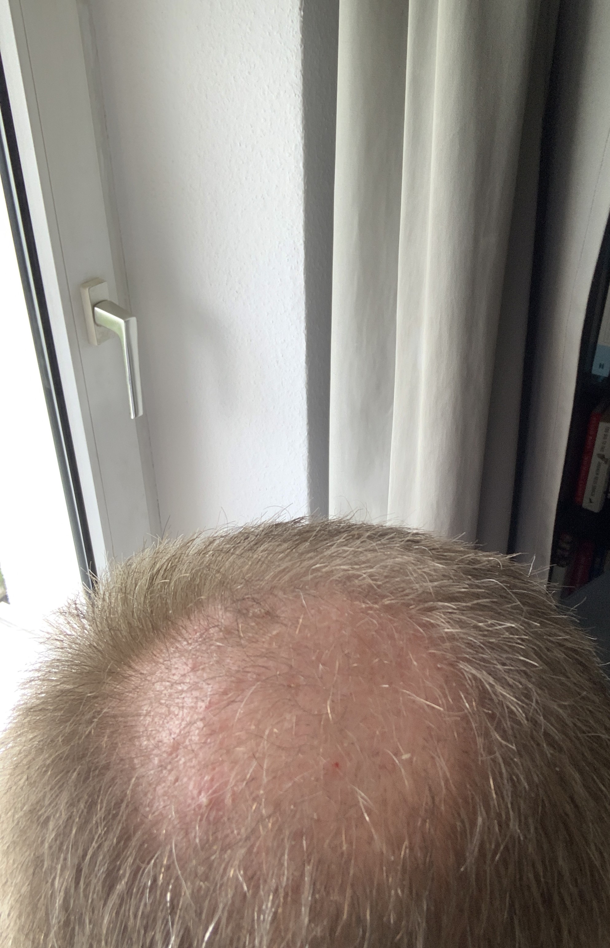 Inzwischen sind 9 Tage vergangen und die Krusten haben sich alle problemlos gelöst. Die Kopfhaut ist zum Teil noch etwas taub und der Spender fühlt sich immer noch sehr gereizt an, sieht aber soweit gut aus. Ich war immer mal wieder draußen einkaufen und gestern Nachmittag beim Geburtstag eines Freundes und es scheint wirklich niemanden aufzufallen, dass ich eine Haar OP hatte (was mich doch sehr erstaunt).