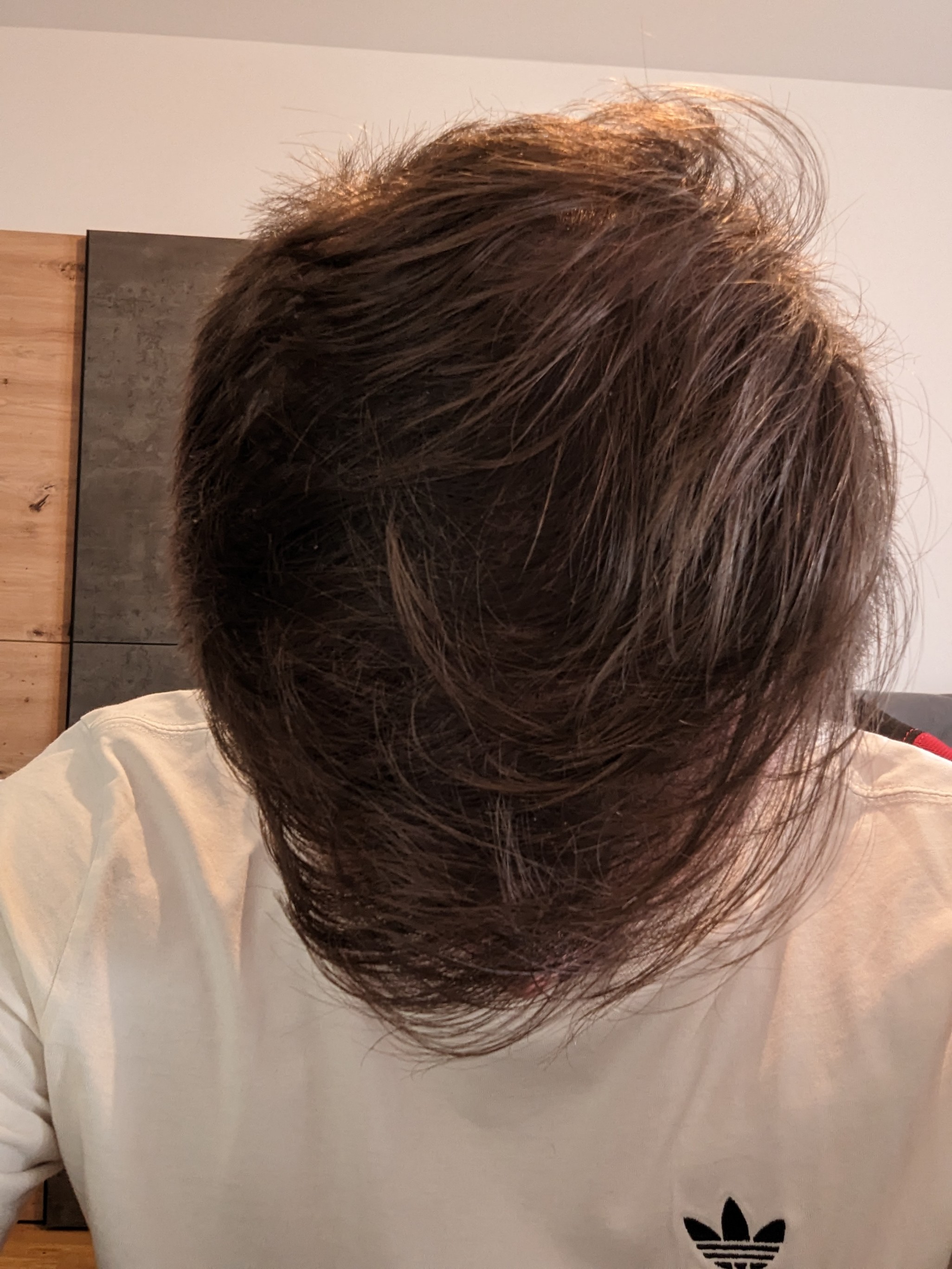 Aktuell ist es noch gut zu kaschieren, aber sobalds nass wird, kann man nichts mehr verstecken. Würde es mit einer HT gehen die lichteren Bereiche aufzufüllen oder würde man damit die noch bestehenden Haare damit schädigen?