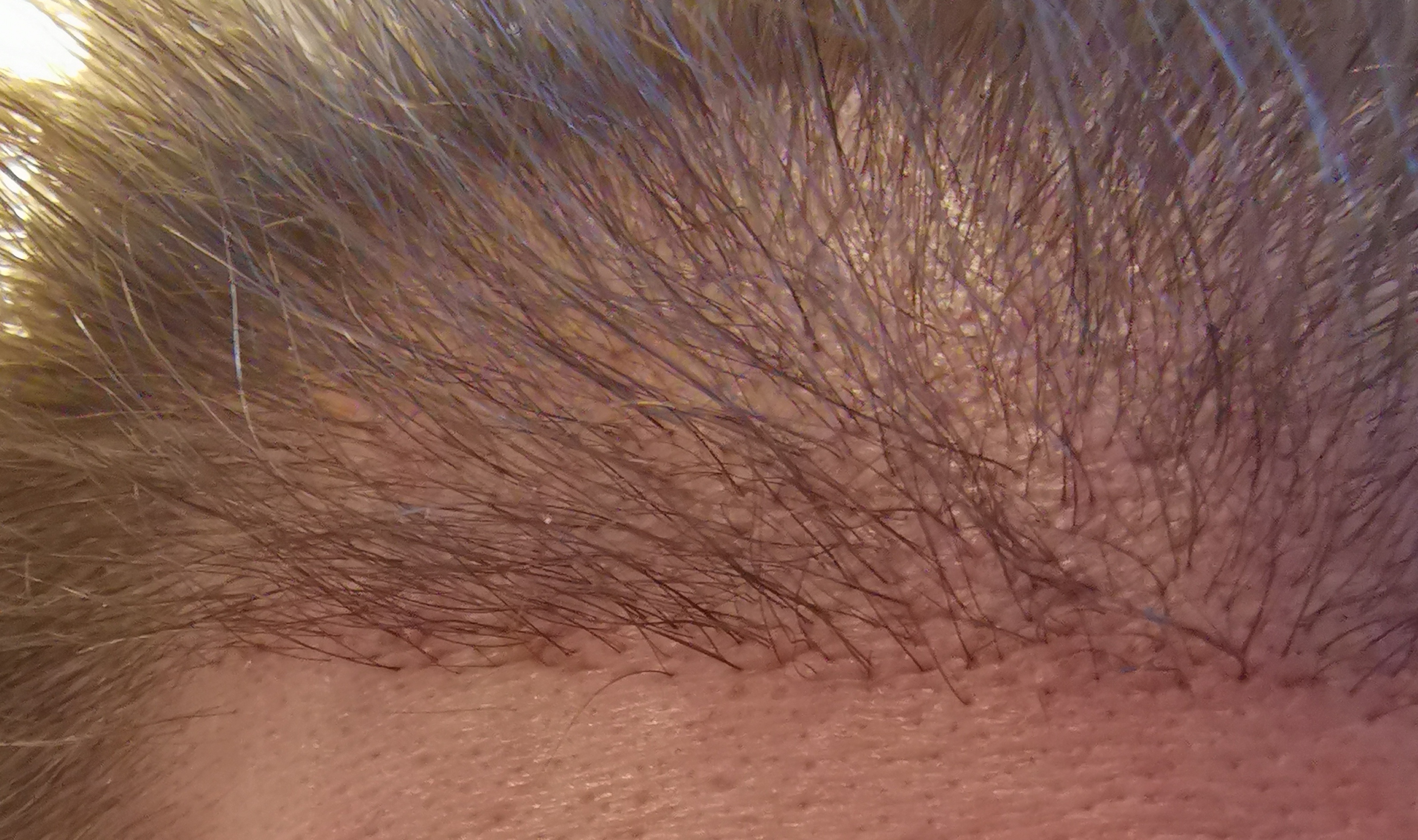 Tag 2 nach der OP. Der Spenderbereich ist schon so gut wie verheilt. Jedoch hat sich eine dicke Schwellung an der Stirn gebildet und mir war heute etwas übel.