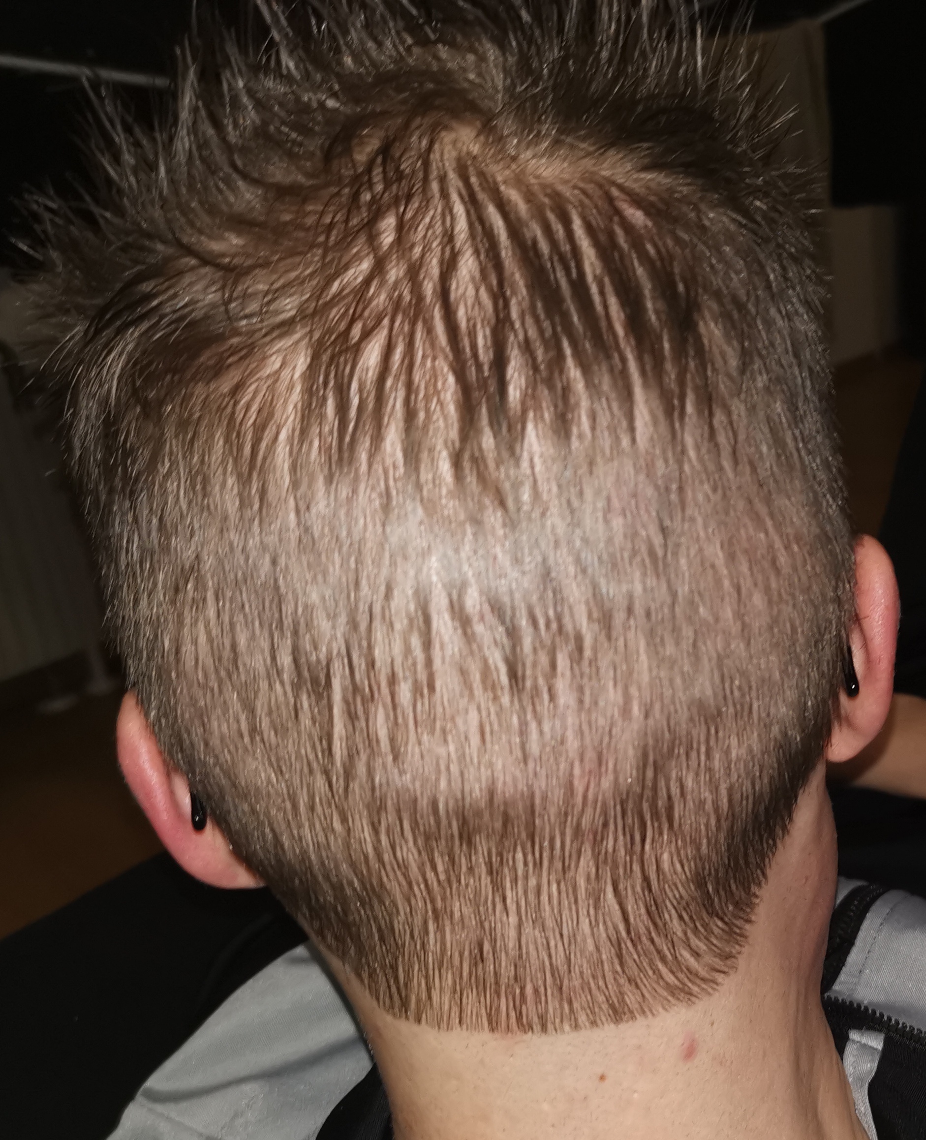 Der Spenderbereich ist vollkommen verheilt und alles ist wieder nachgewachsen. Keine Narben oder dergleichen sind geblieben.