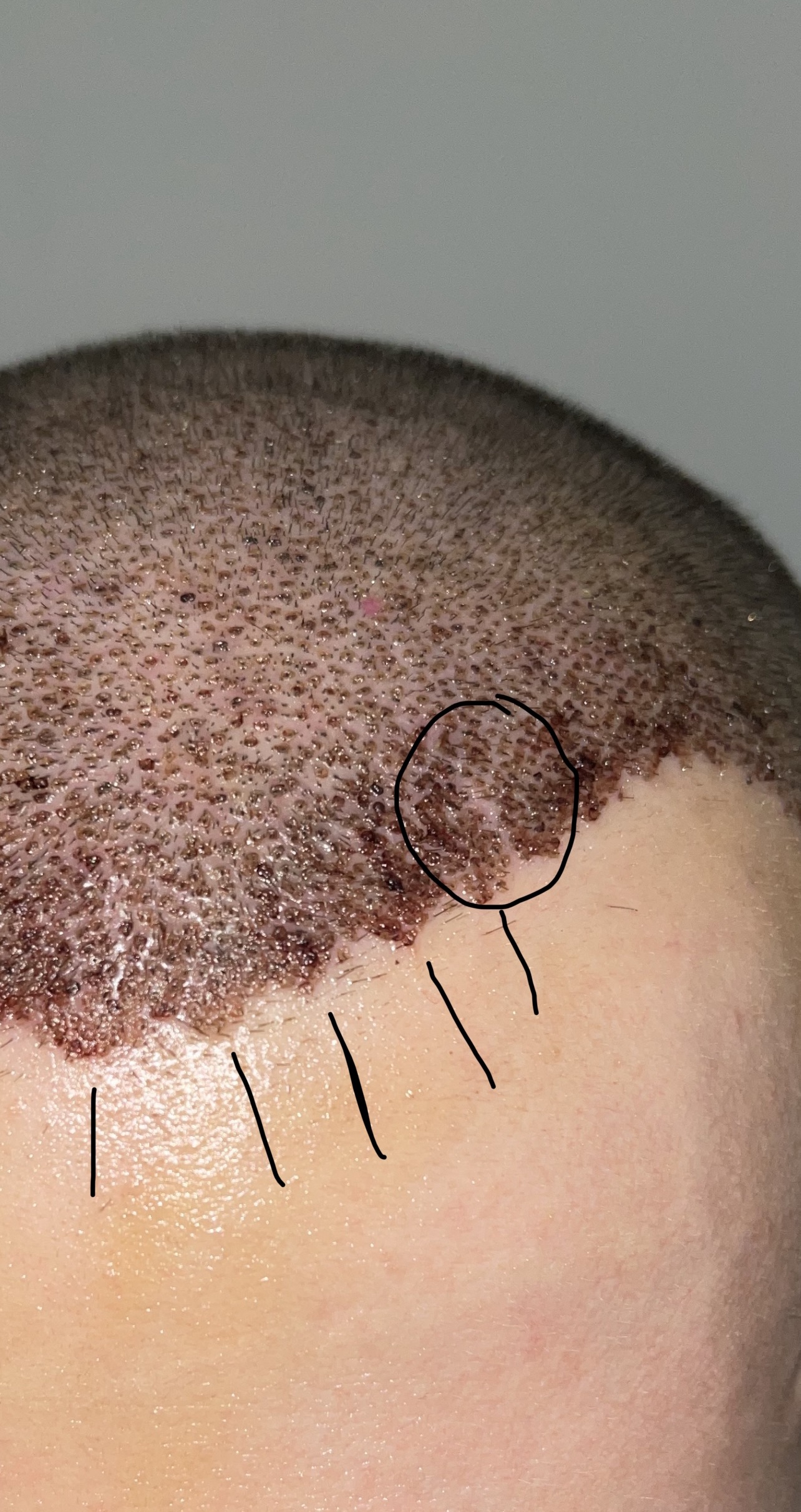 Die Krusten ziehen irgendwann wenn sie trockener werden die Haare in eine Richtung daher sehen manche Stellen lichter aus und andere dichter. Hast du ein Post OP Bild? Sonst sieht es nach sauberer Arbeit aus.
