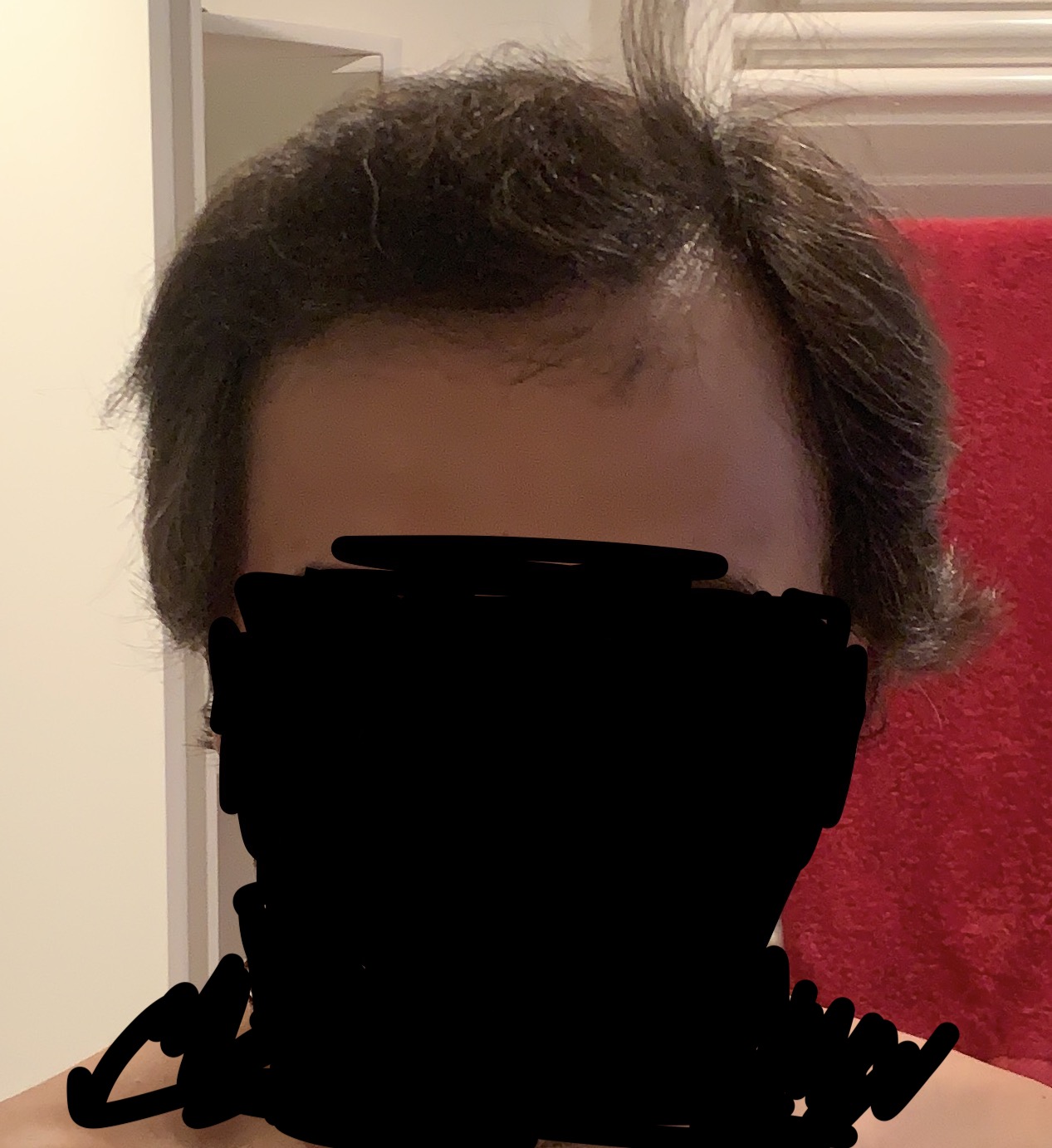 Die nativen Haare vorne sehen auf den Fotos viel unschöner aus als es in Wirklichkeit ist und wenn diese lang genug sind können diese mit in die Frisur genommen werden. Die Transplantate sind logischerweise auch noch sehr kurz und teils auch noch dünn und strohig.