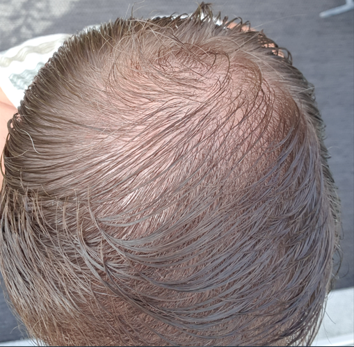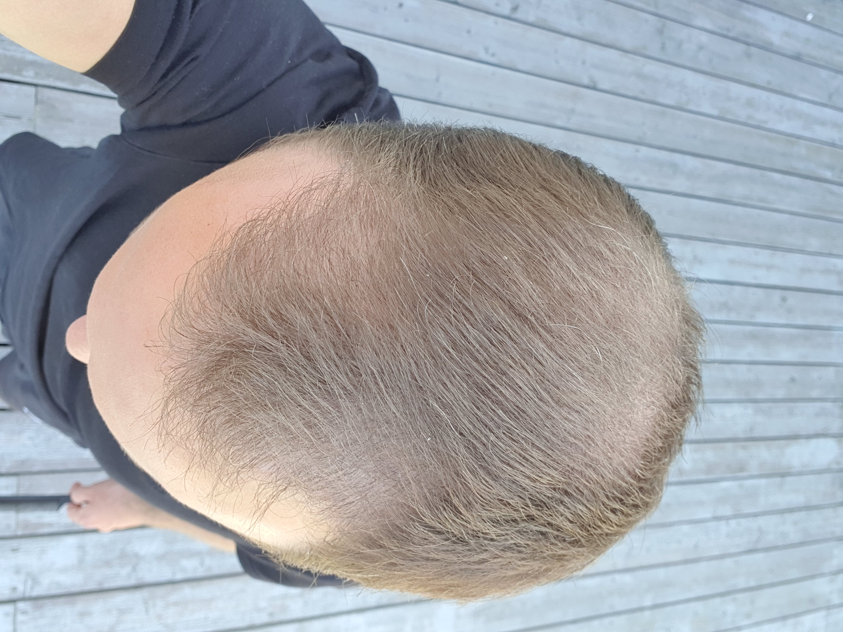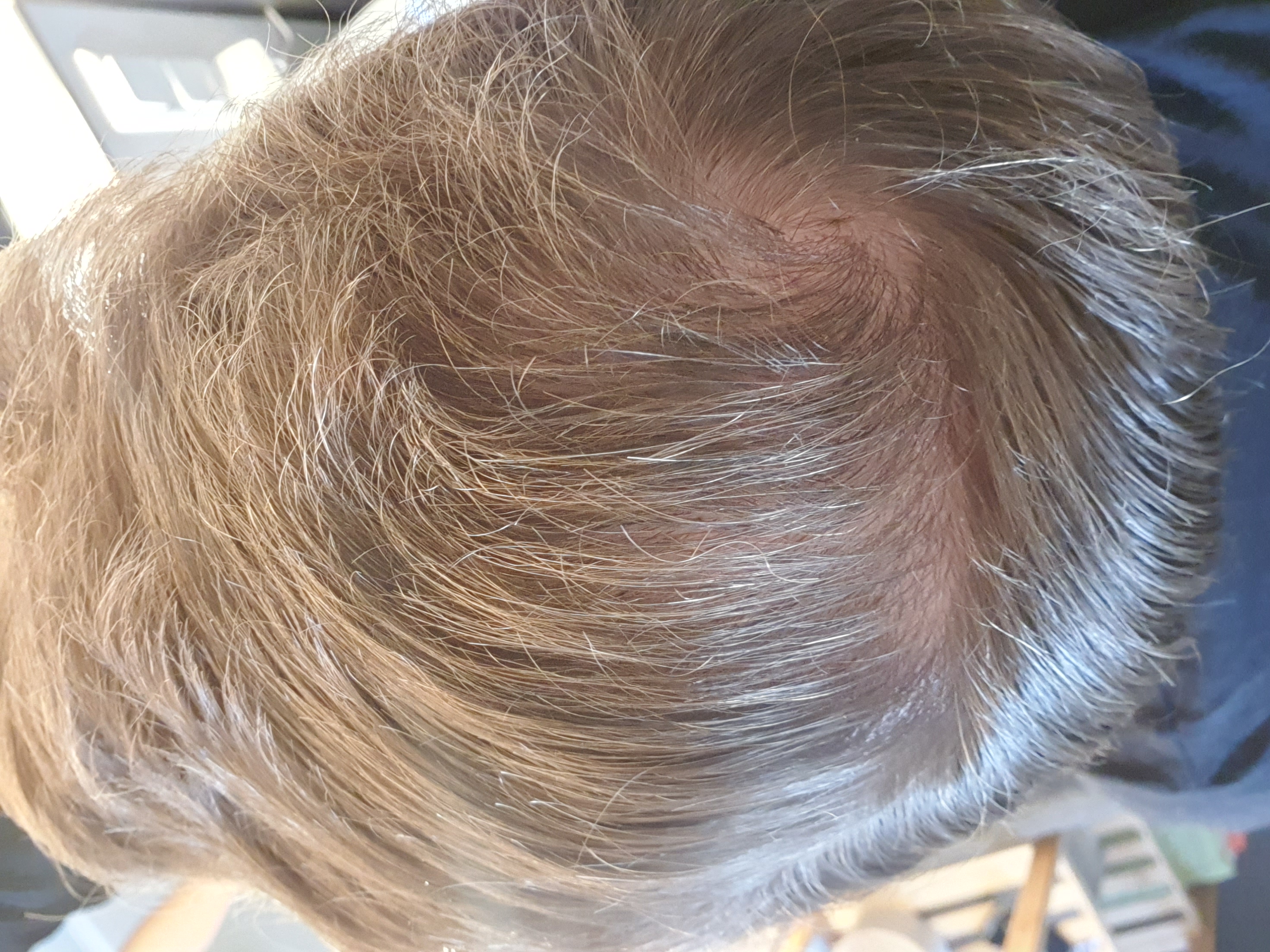 Mit dem Anwuchs auf dem Oberkopf bin ich bereits recht zufrieden und ich muss gestehen, dass ich doch noch mehr Resthaar auf dem Kopf hatte, als ich annahm. Mit langen Haaren sah das alles irgendwie fusseliger und dünner aus, als es in Wirklichkeit ist.