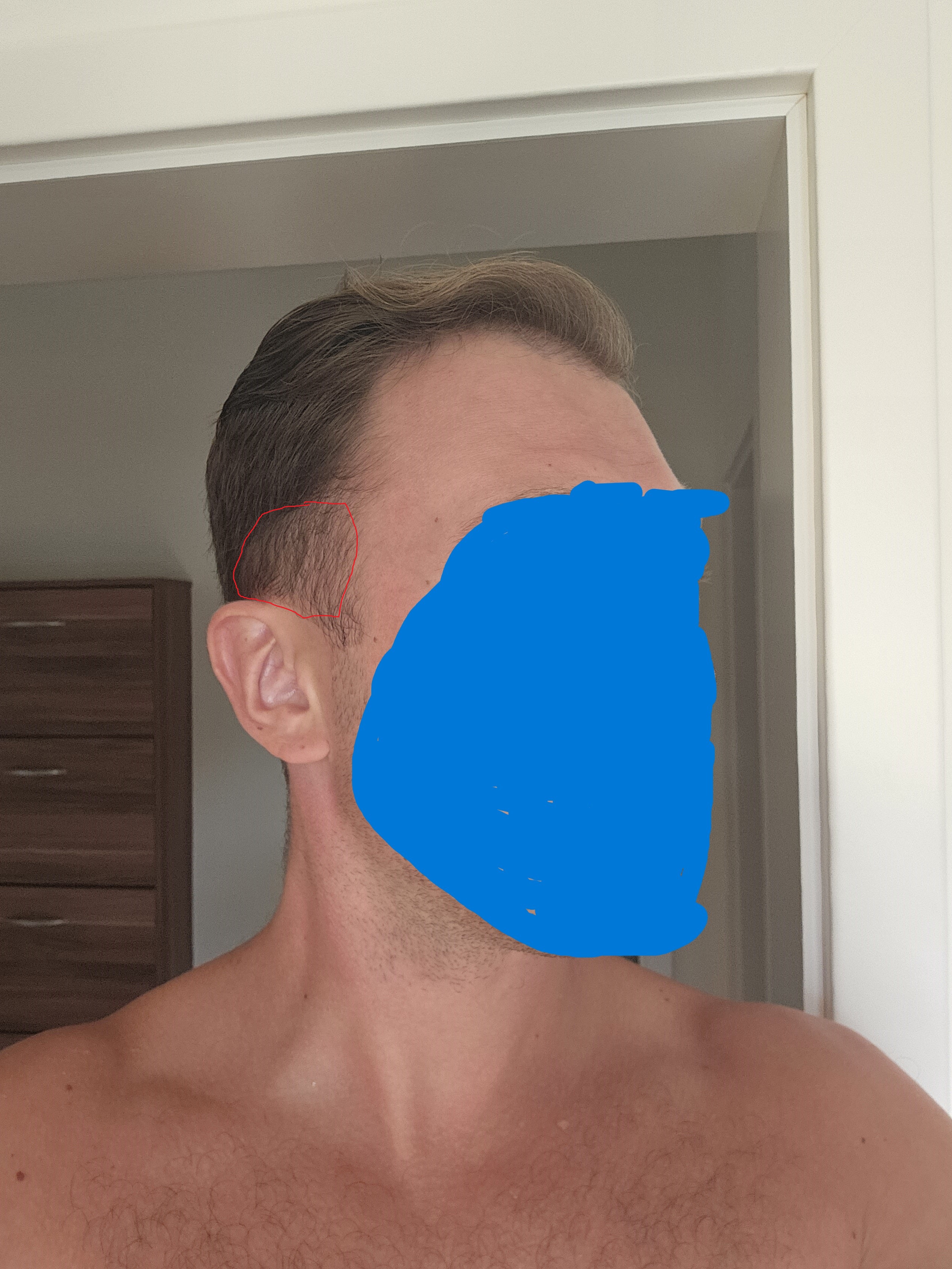 ich habe mir die Mühe gemacht und die mit freiem Auge schon Problemstellen einzuzeichen. Man erkennt schon mit freiem Auge eine Ausdünnung, eine sogenannte retrograde alopecia.