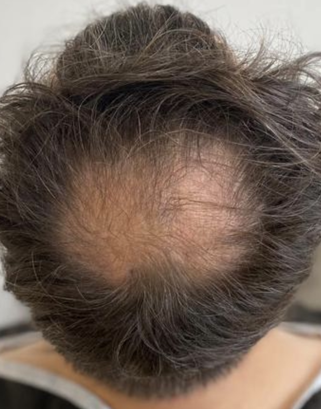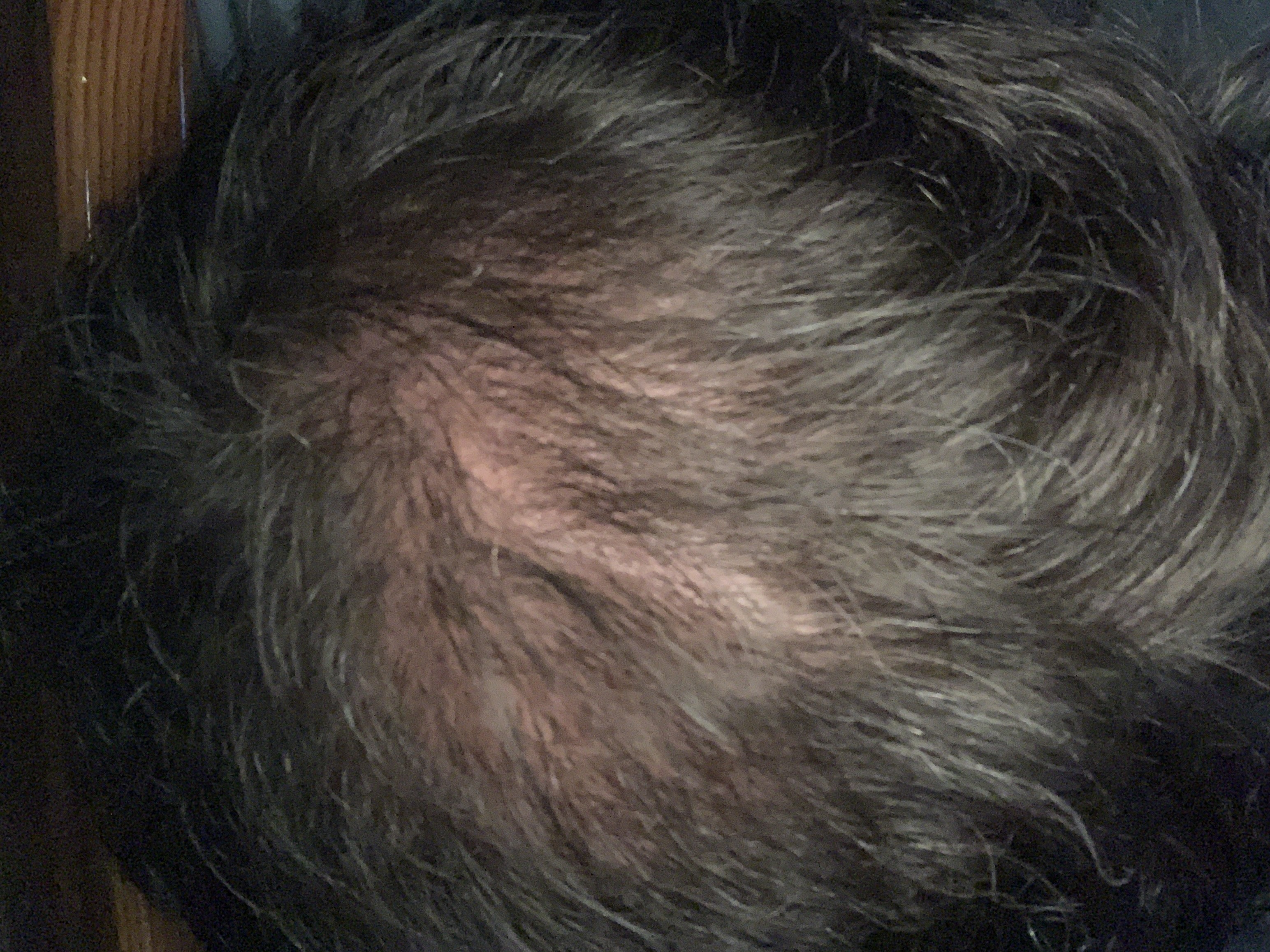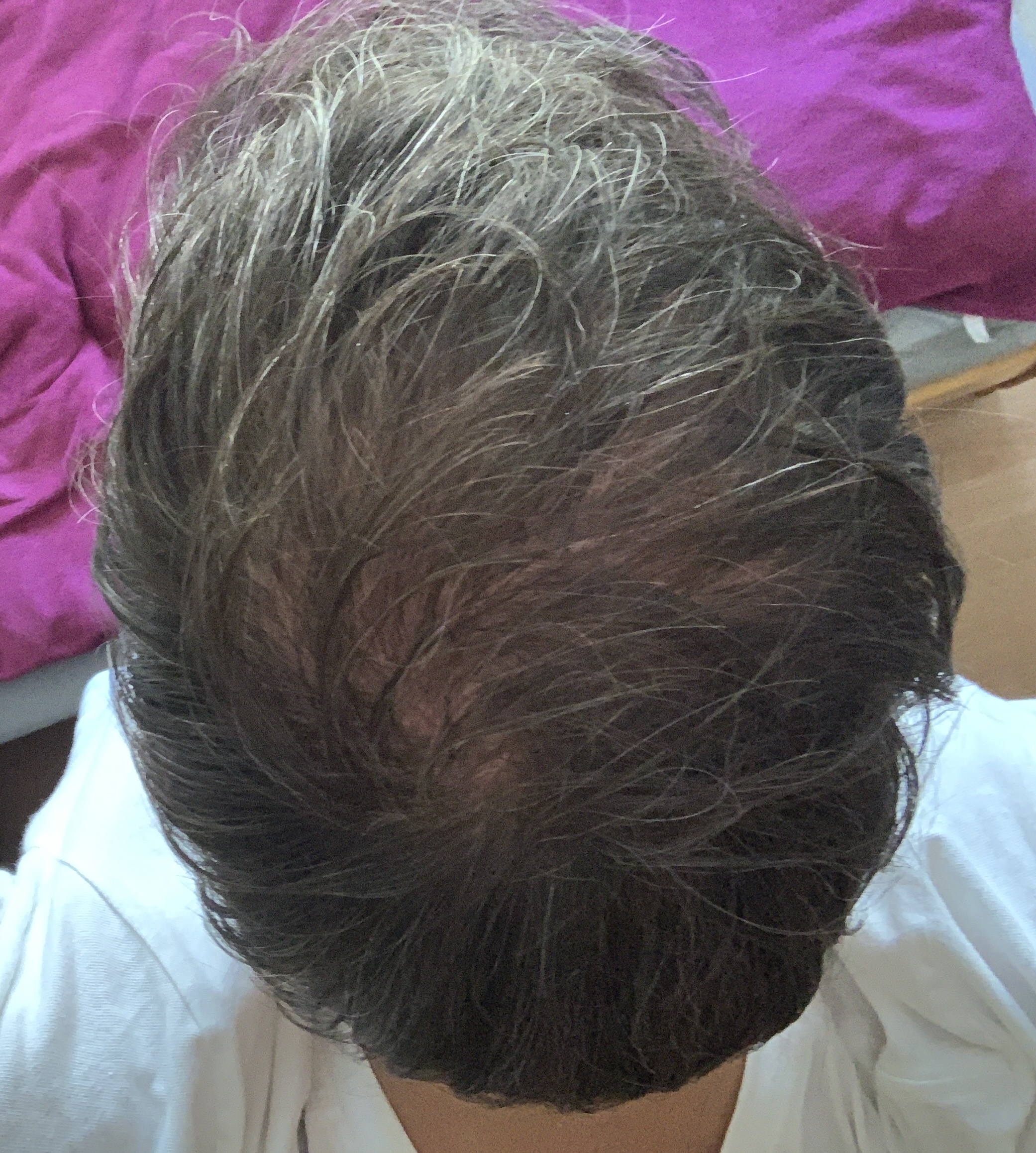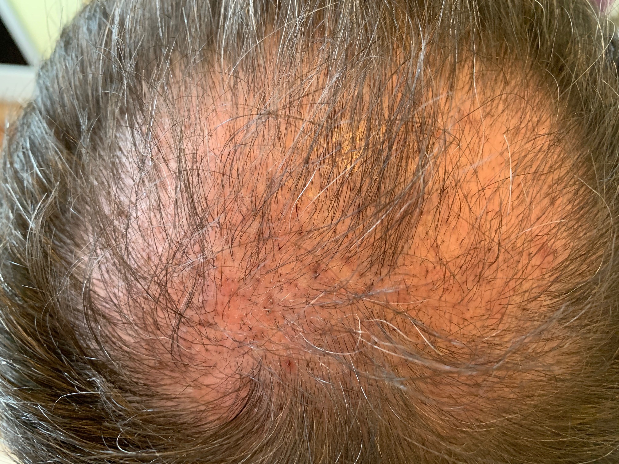 Mich irritiert etwas, dass der transplantierte Bereich so deutlich vom restlichen Bereich zu unterscheiden ist. Im Prinzip genau wie vorher. Wenn ich das Foto zoome, sehe ich allerdings noch ziemlich viele kleine Haare, was mir Hoffnung gibt.