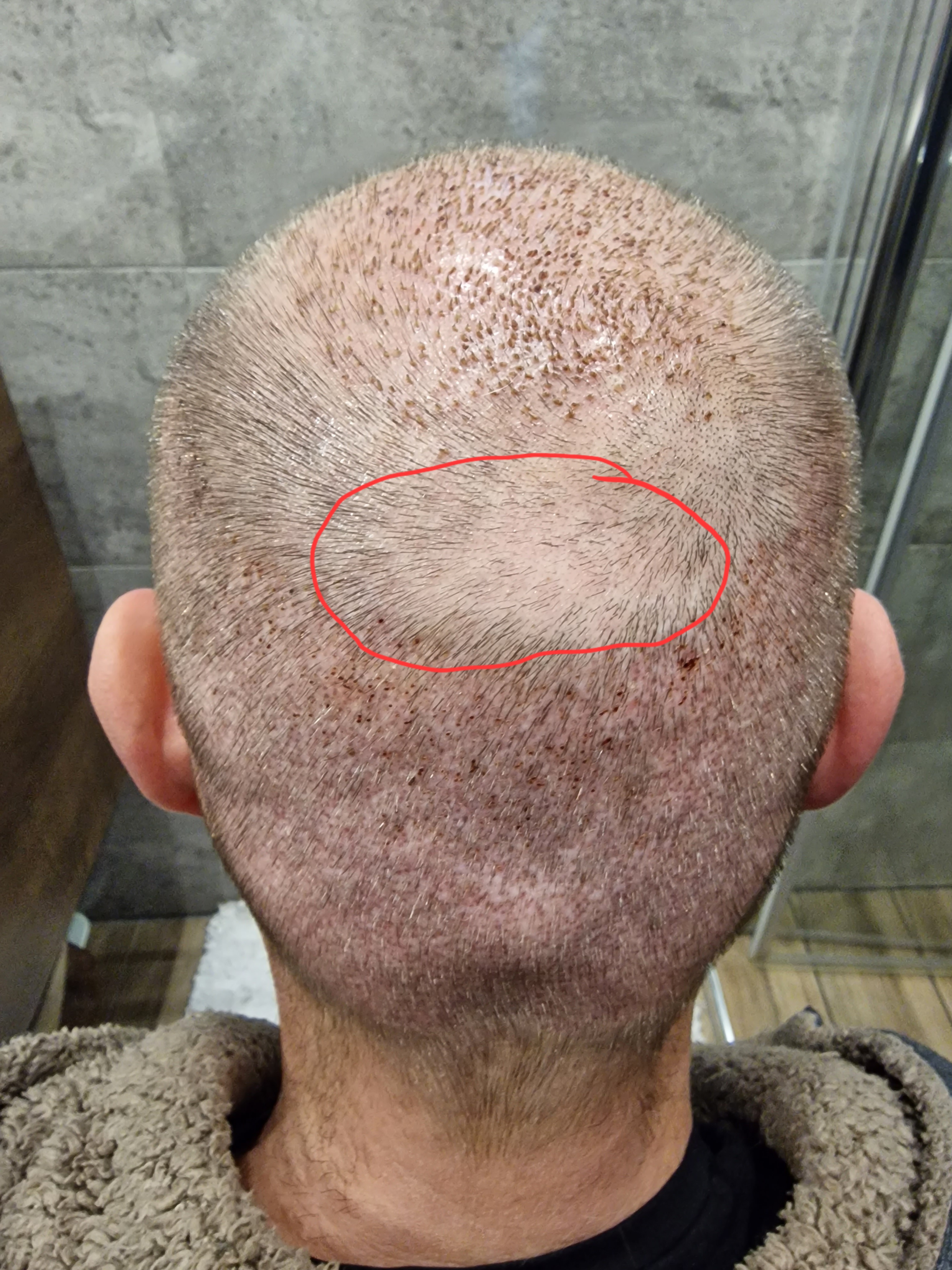 Für die Stelle am Hinterkopf reichen die Grafts bei weitem nicht, selbst die Tonsur ist nur spärlich bepflanzt und wird niemals dicht werden.