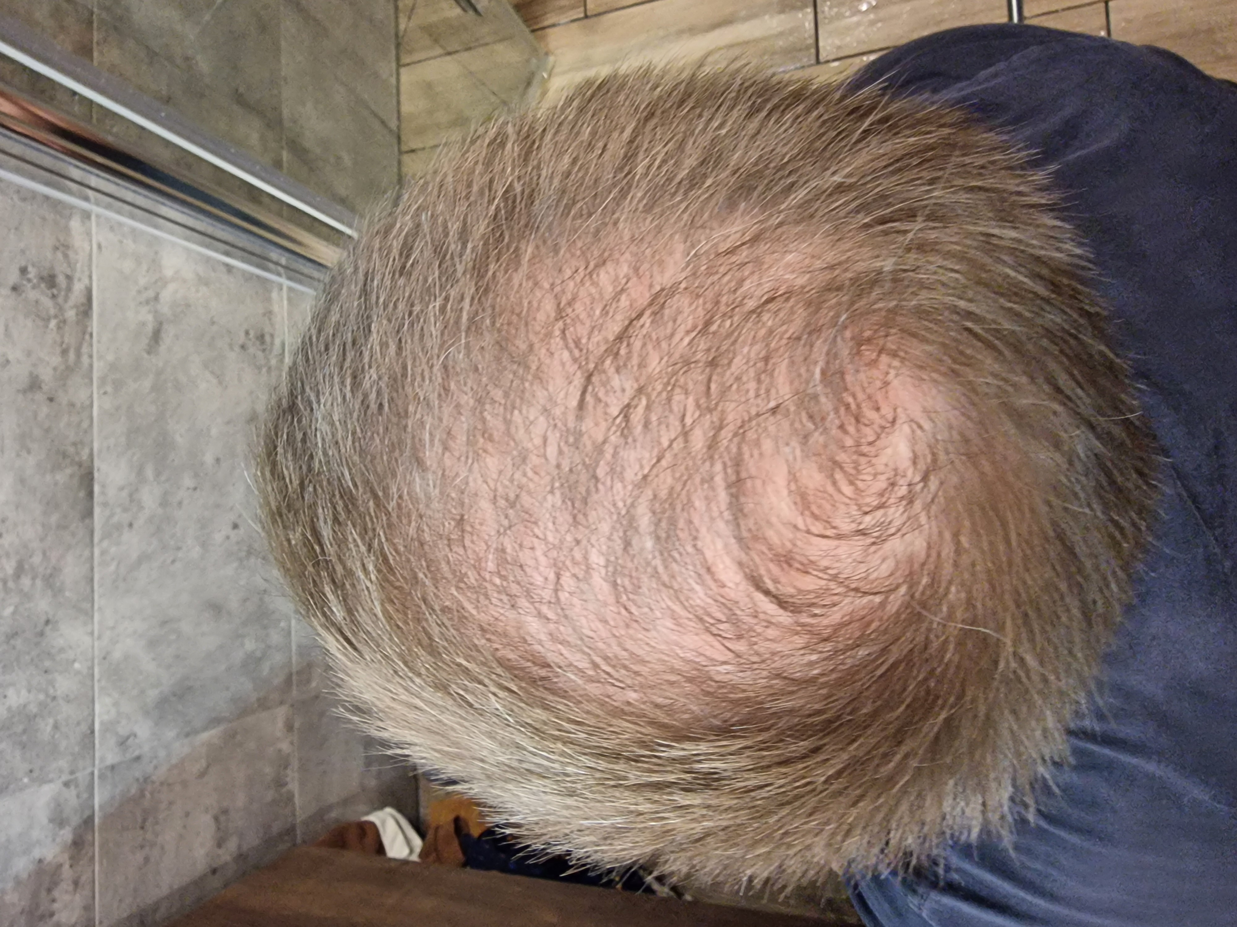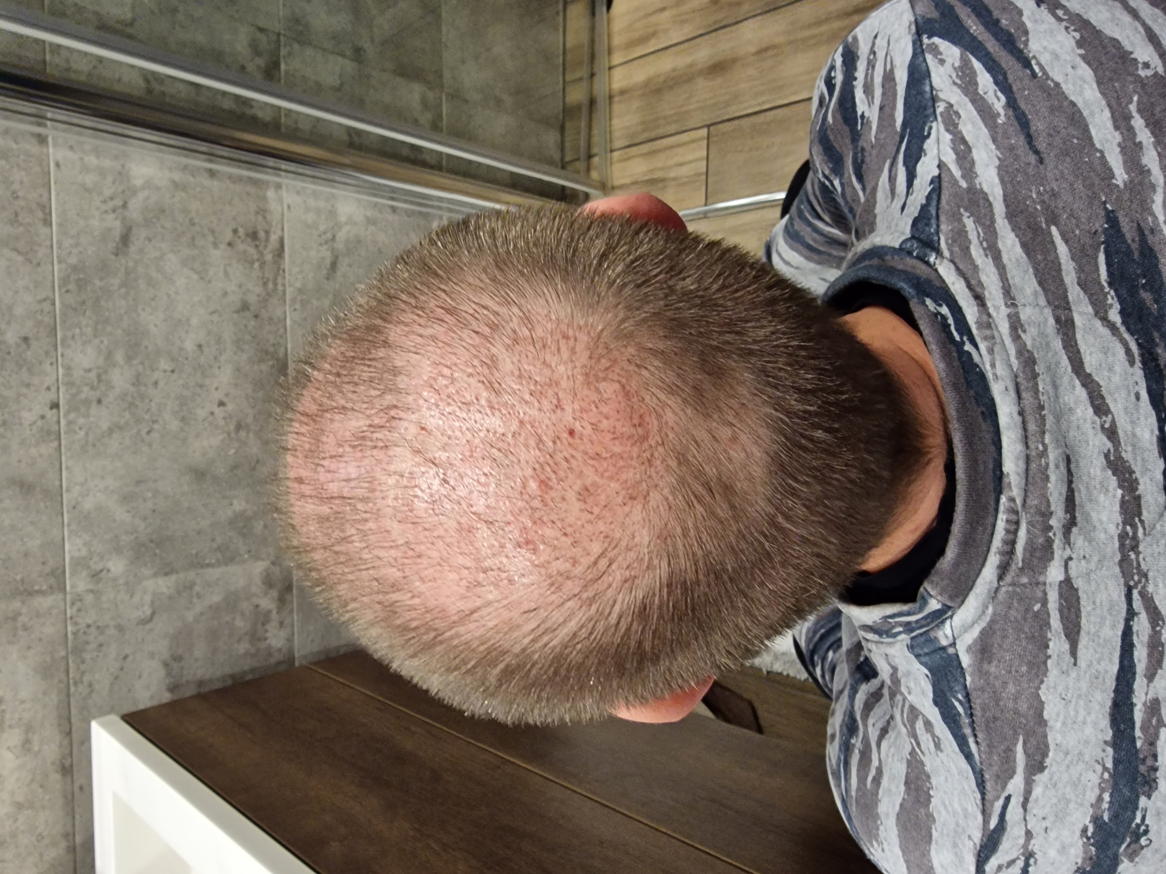 Im vorderen Bereich des Empfängerareals verzeichne ich ein paar Kreisrunde stellen, an welchen die Haare komplett ausgefallen sind. Sieht recht komisch aus und ich hoffe sehr dass es nur vom Shock-Loss stammt und die Haare wieder nachwachsen. Denn dort waren ja zuvor schon transplantierte Haare, die eigentlich nicht mehr ausfallen können!