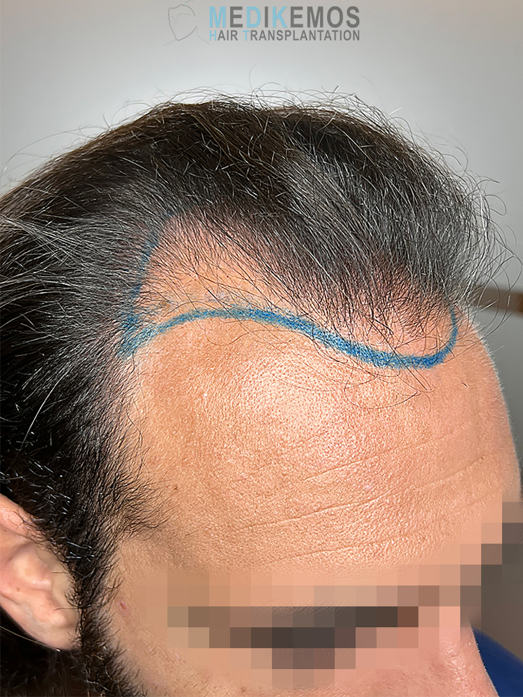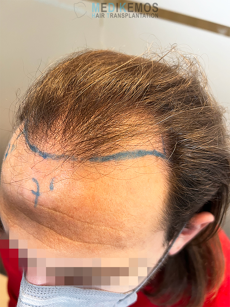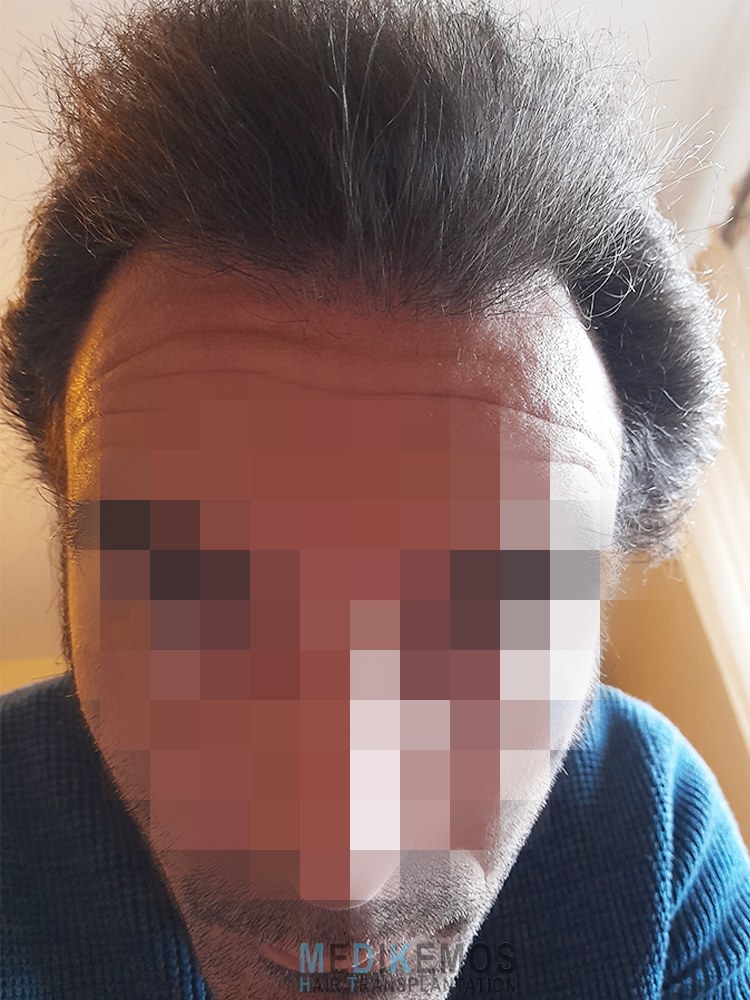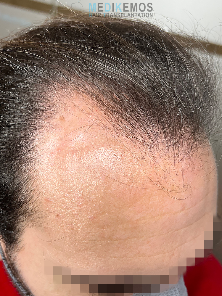 Ziel des Patienten war es, ein natürliches Aussehen sowie eine ausreichende Dichte und Abdeckung des Stirnbereichs und der Schläfen zu erreichen. Der Arzt intervenierte auch im Grenzbereich zwischen Vorder- und Mittelkopf, da dieser einer fortschreitenden Ausdünnung unterliegt.