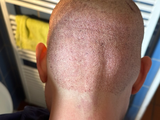 Ziel war eine dichtere Haarlinie, Verkleinerung der GHE und das Stopfen der Lichtung (keine mega Dichte). Um den Donor zu schonen sind 500 Barthaare auf den Hinterkopf gewandert. Insgesamt wurden 4000 Grafts transplantiert. Der Donor hat also noch etwas Reserve (ca. 3000). Ebenso der Bart (ca. 500).Dicke der Haare ist sehr gut, Anzahl der vorhandenen Multigrafts war durchschnittlich.
