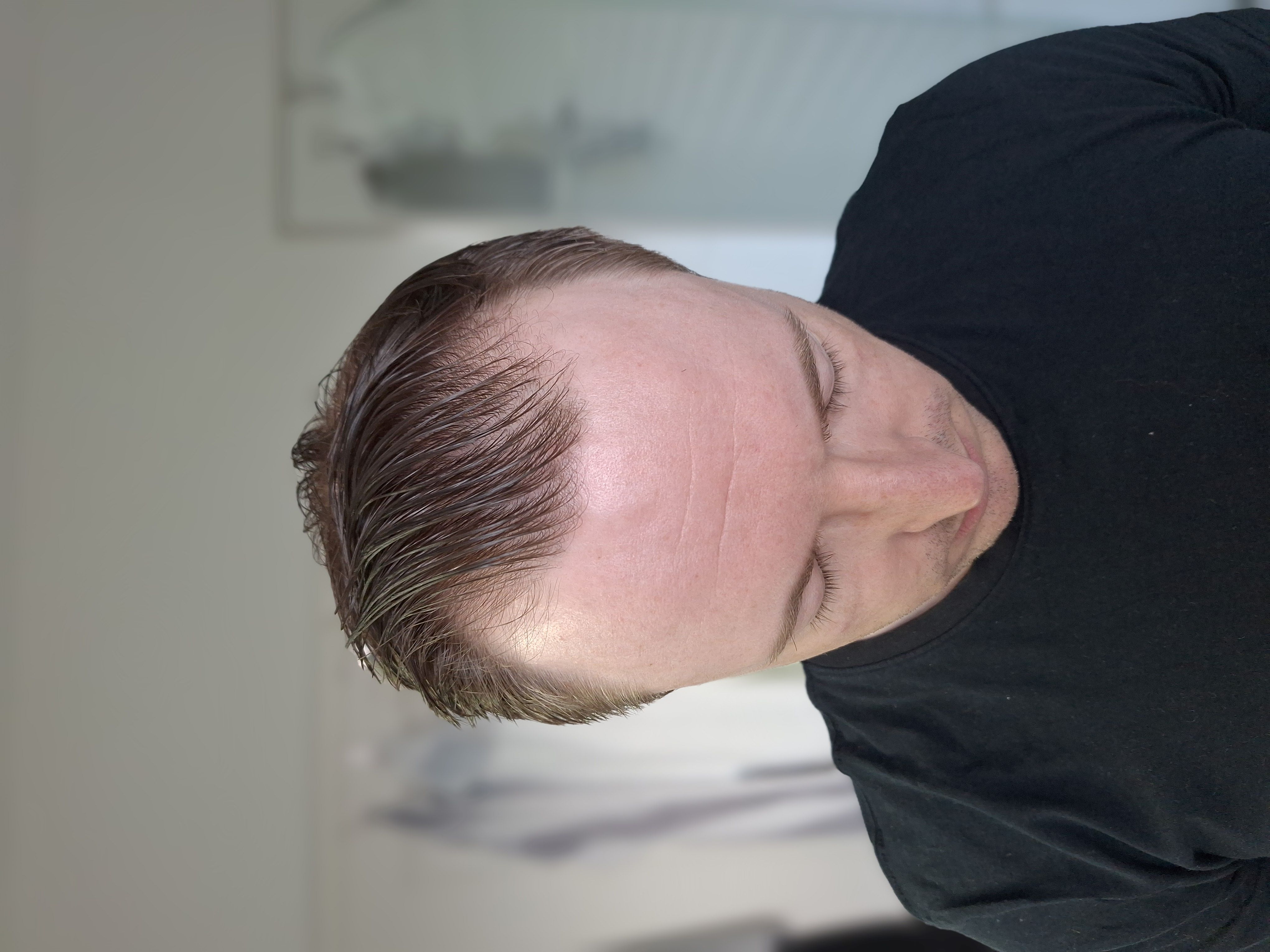 -Anhand der Fotos wird auf 2300-2800 Grafts (50 Grafts /cm2) für das Schliessen der Geheimratsecken und das Verdichten der Haarlinie bis zur Mitte Oberkopf geschätzt.