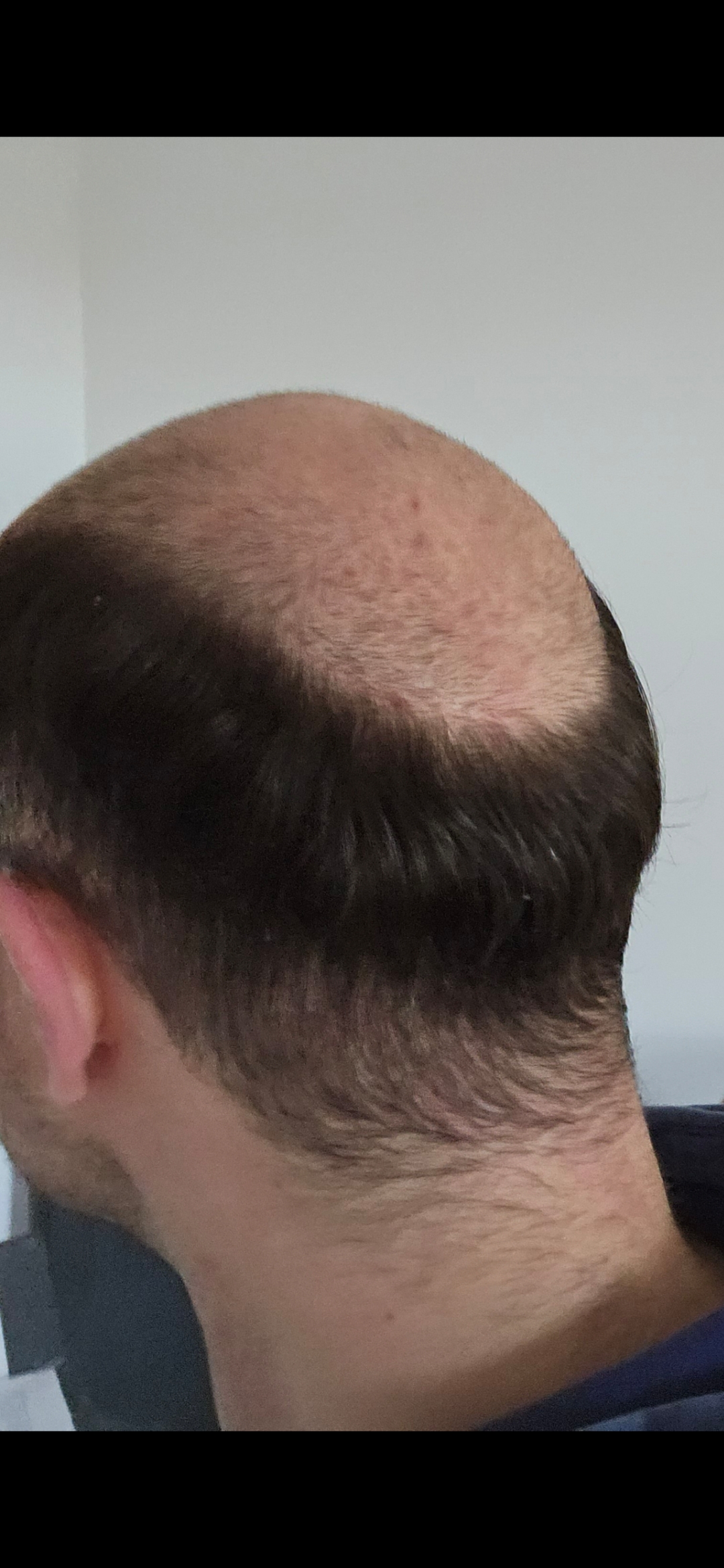 * Aktueller Haarstatus nach der Hamilton-Norwood-Skala: schwer einzuschätzen da Tonsur wg. Haarteil rasiert, vermutlich Richtung V, Va