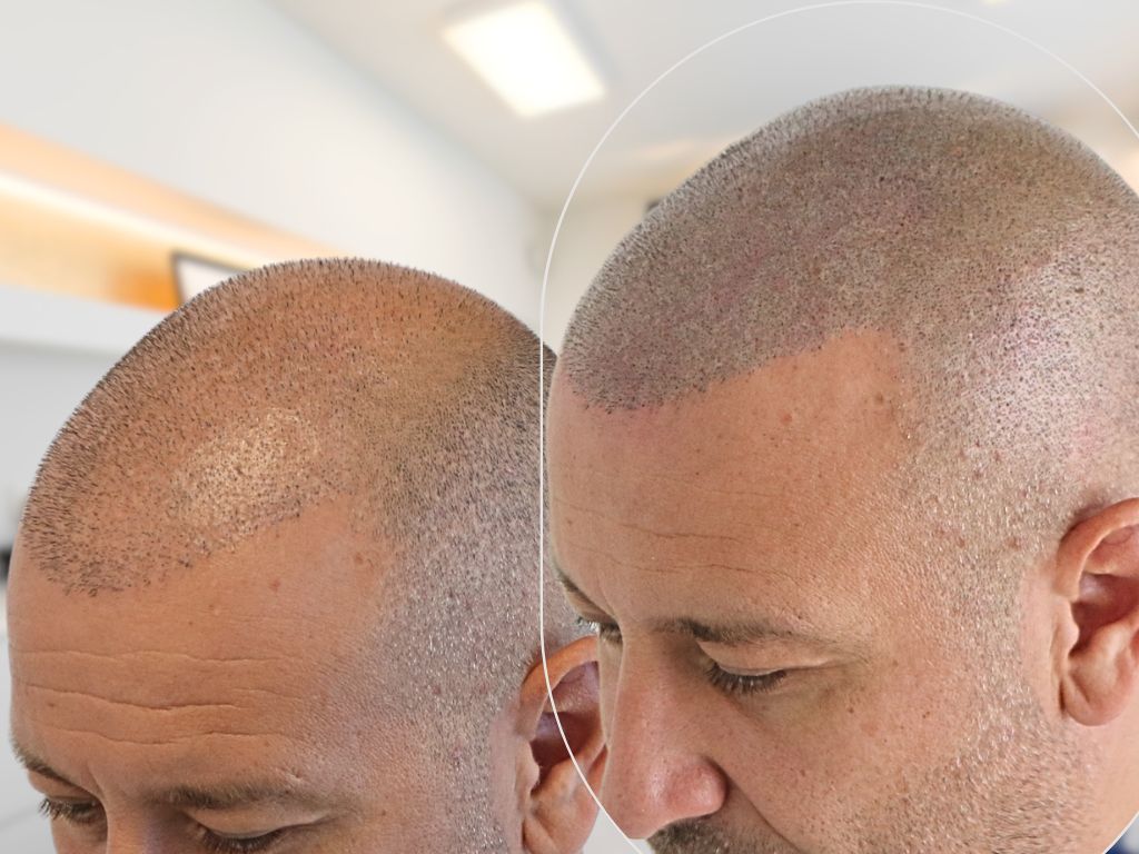 Die Lösung: Haarpigmentierung! Mit dieser Technik konnten wir die Illusion von Haarstoppeln im kahlen Bereich erzeugen, wodurch eine gleichmäßige und einheitliche Dichte entstand.