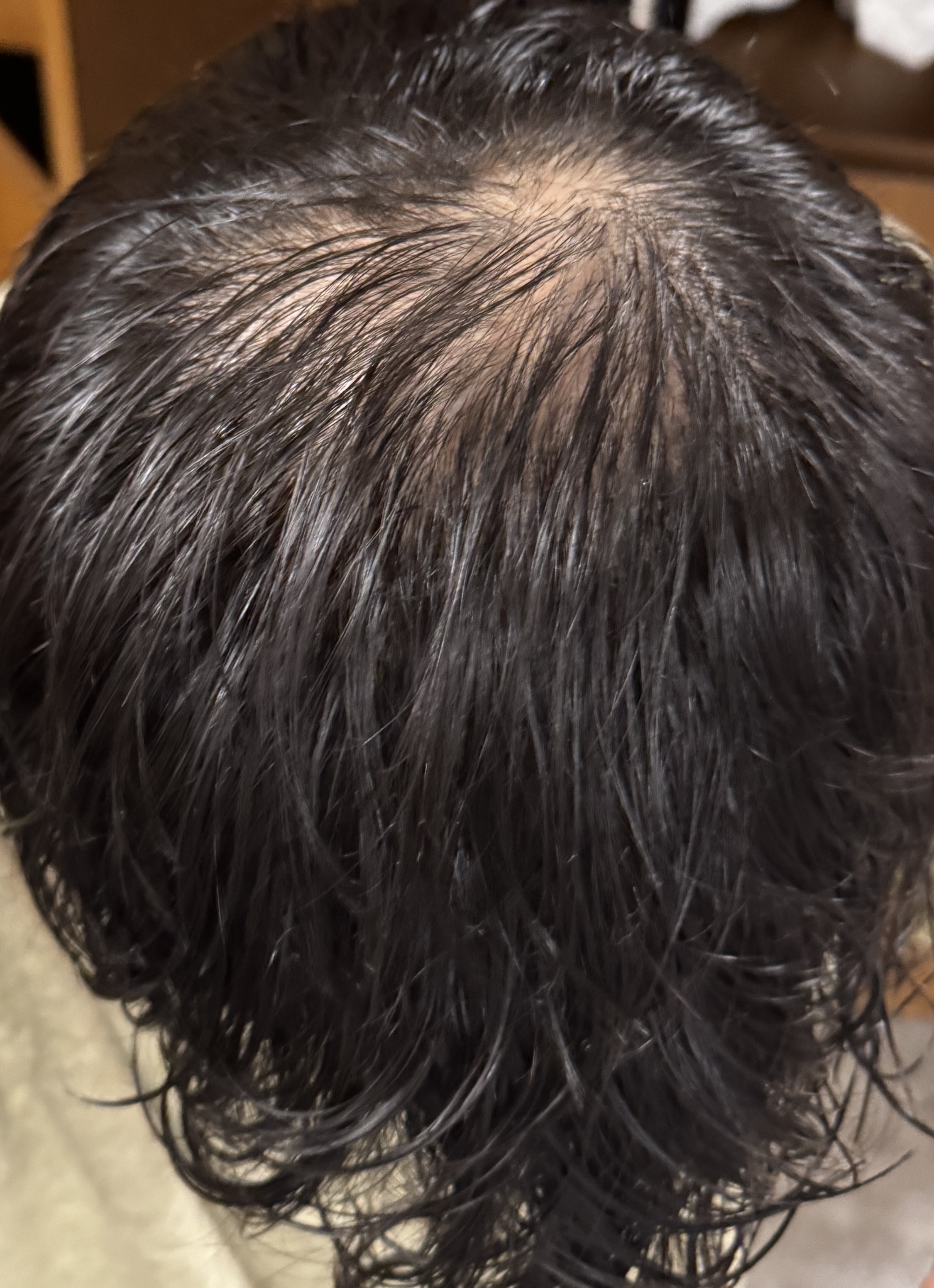 Mach die Haare mal nass und kämm sie nach vorn, dann ein Bild von oben.