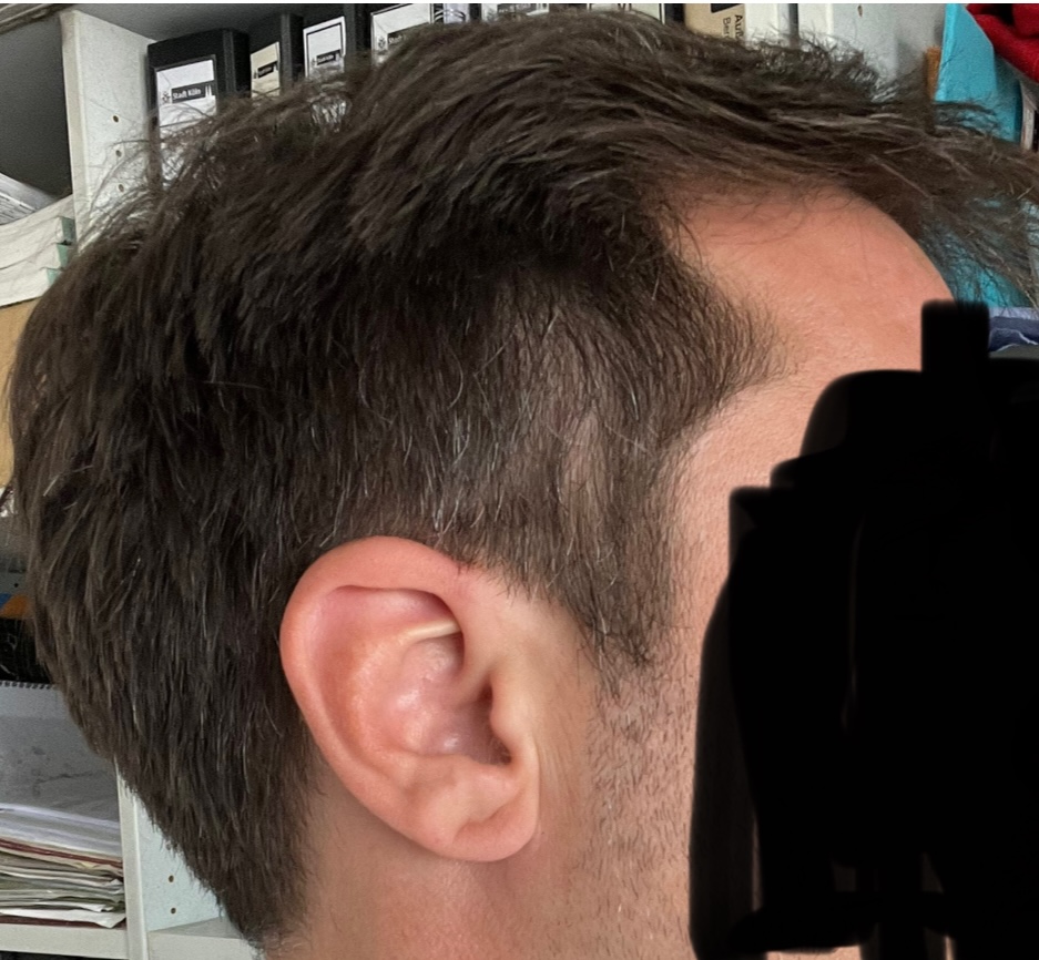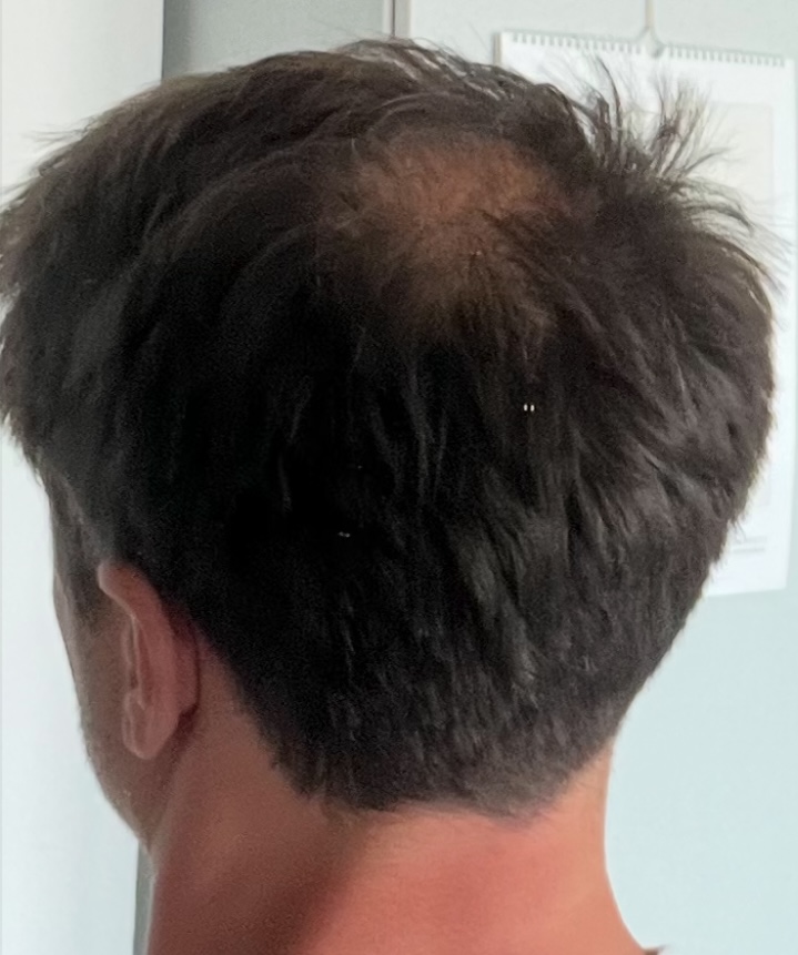 Ziel ist, dass der Landeplatz am Hinterkopf verschwindet und auch nach vorne hin - denn hier hat es sich in den letzten zwei Jahren ganz schön gelichtet - nachhaltig wieder dichter wird. Ich brauche keinen Buzzcut.
