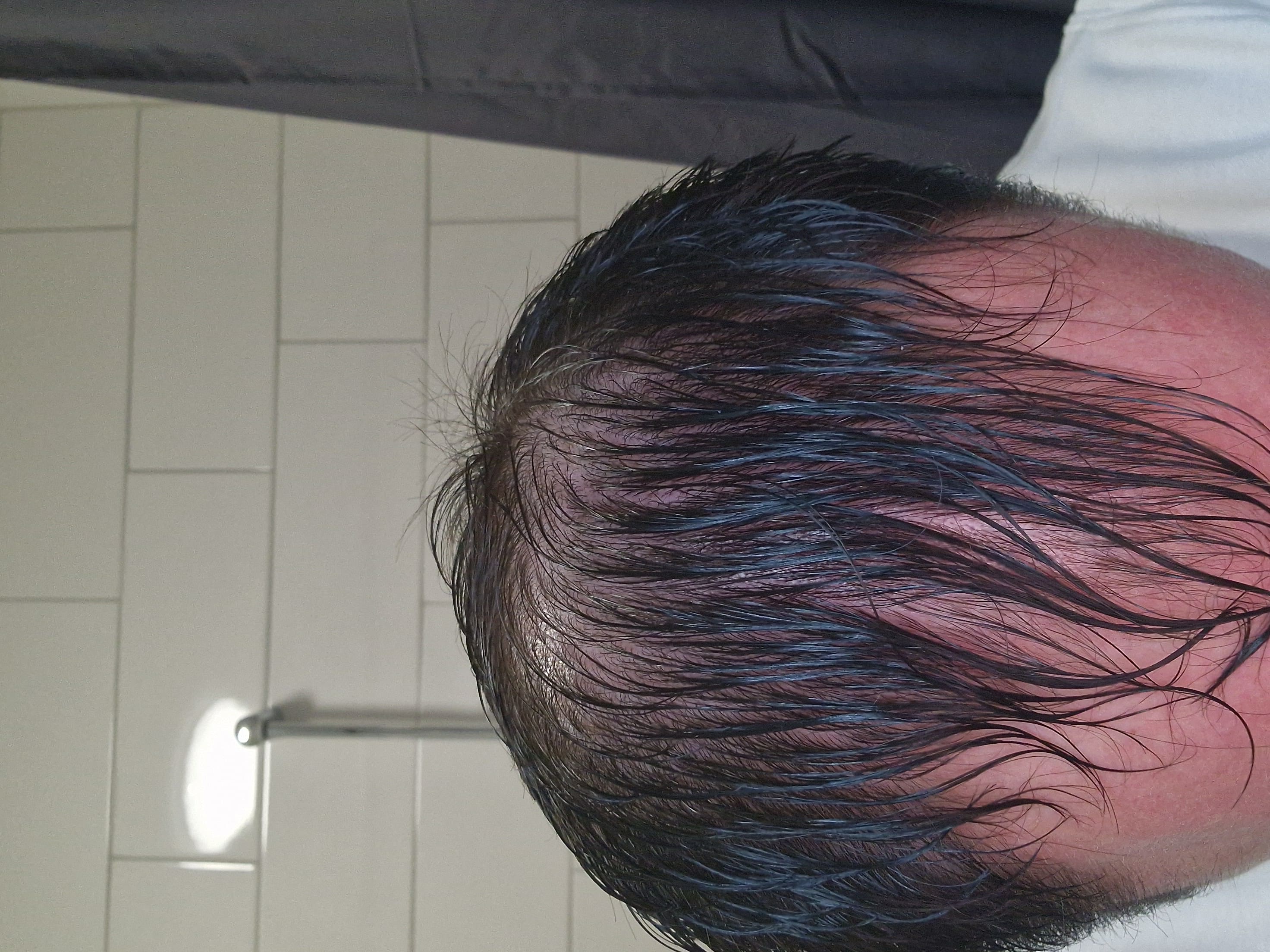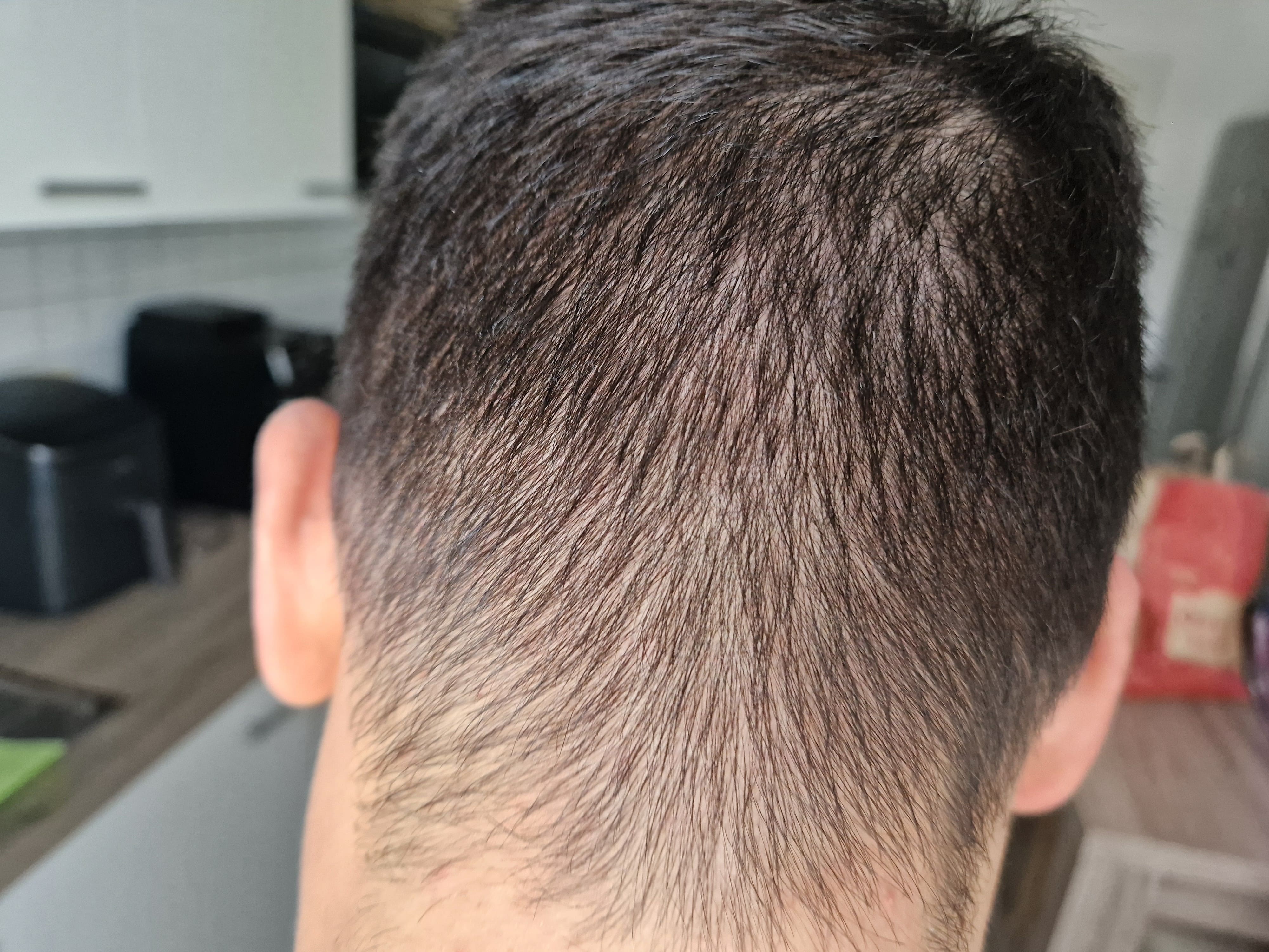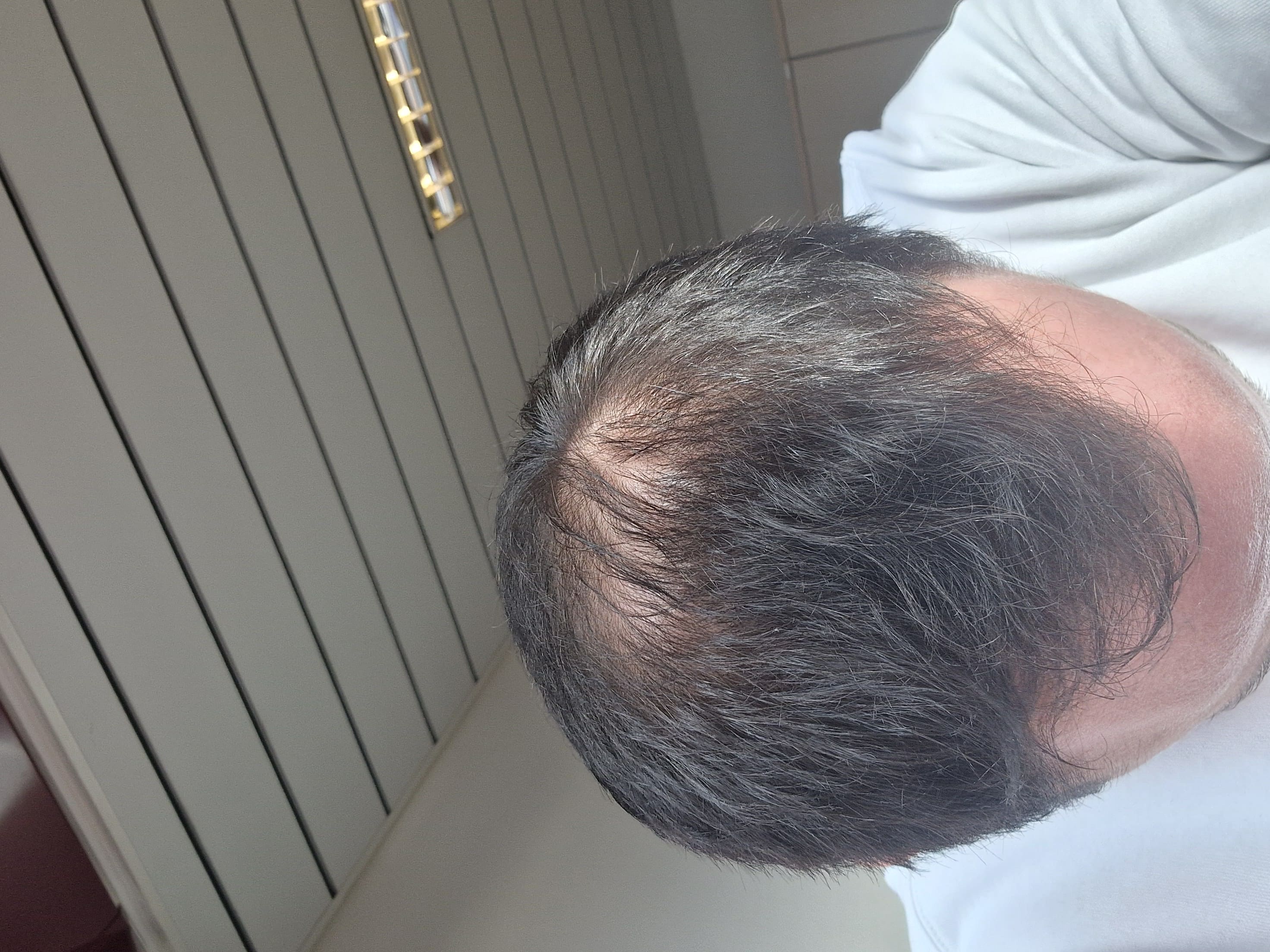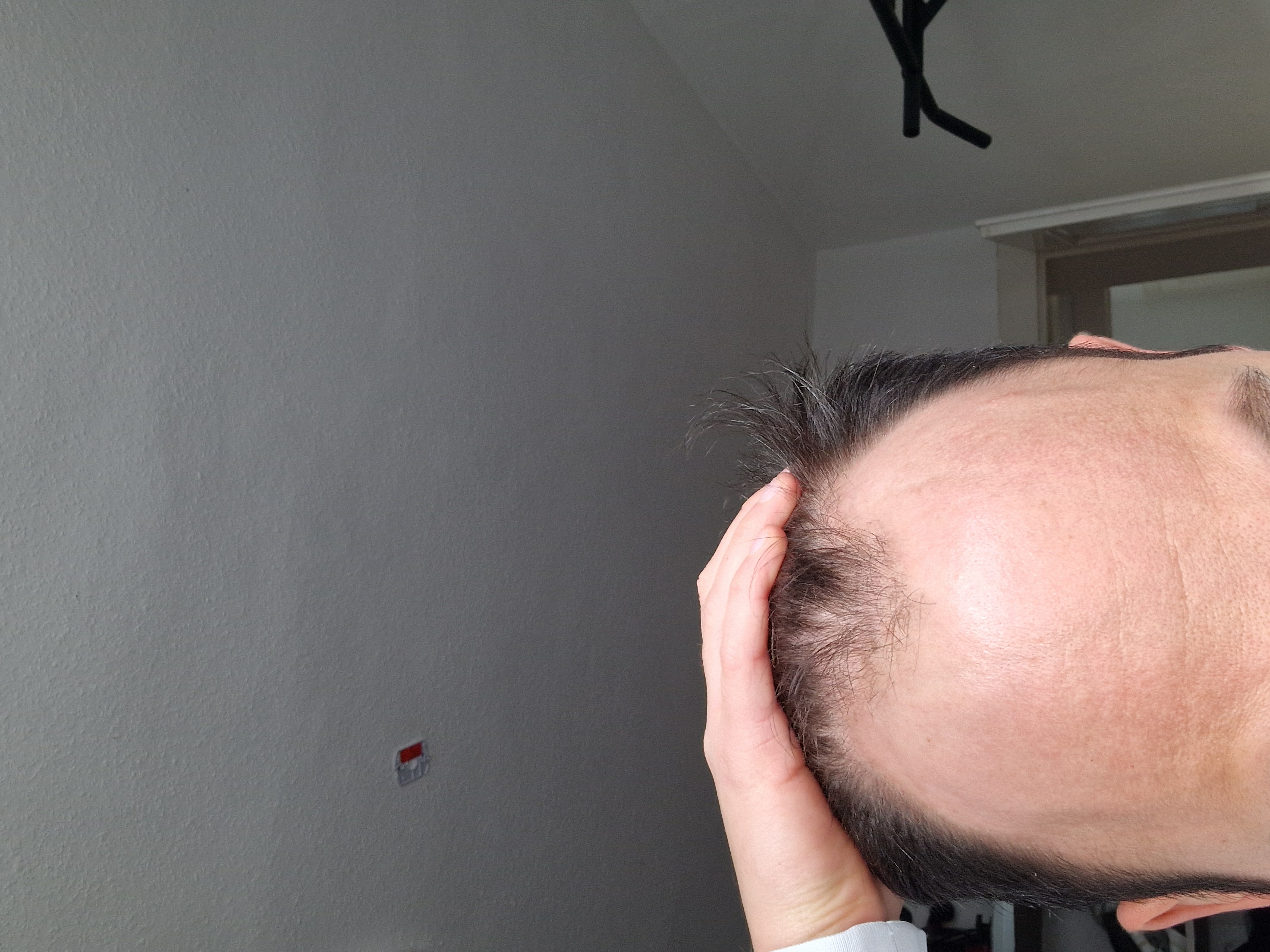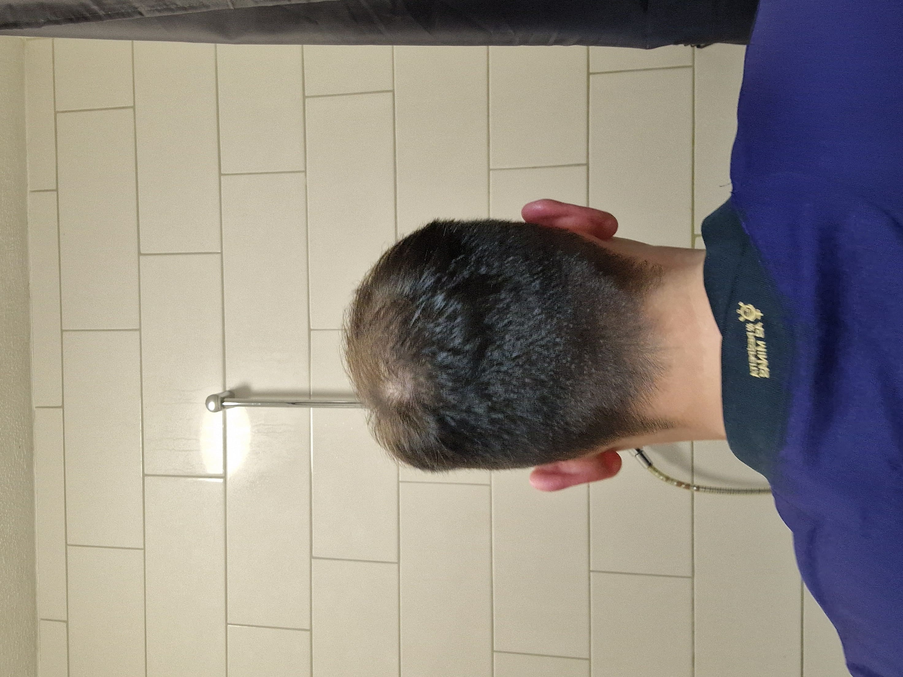 Zum wording noch eine Anmerkung: ich sehe bei dir eher eine Frontglatze als GHE. Gut möglich, dass sich die Insel in der Mitte in den nächsten Jahren verabschiedet. Bei dir liegt auch ein diffuser Haarausfall vor, also der gesamte Oberkopf ist betroffen und dünnt aus.