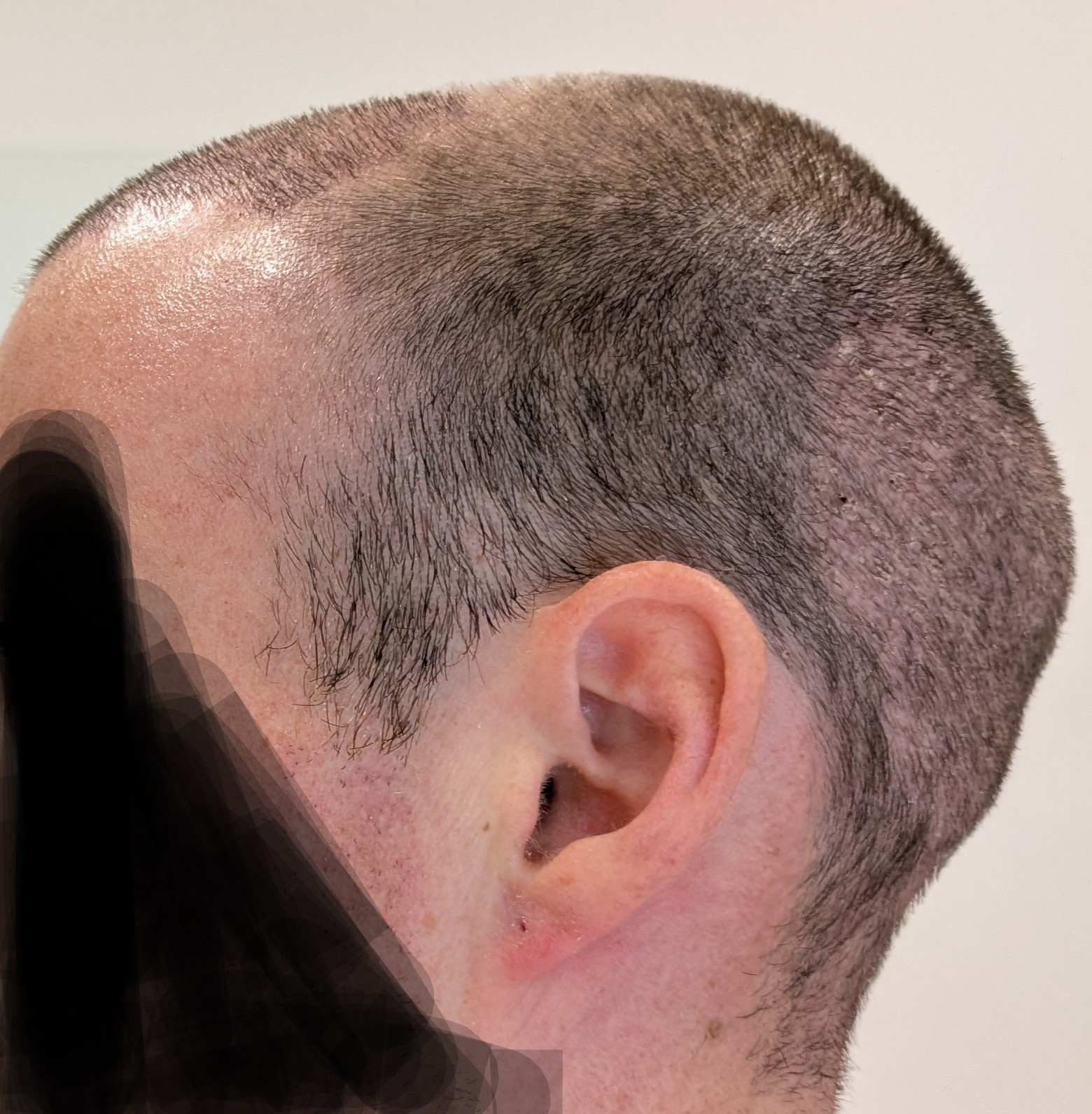 Höhe und Design der Haarlinie finde ich auf den Fotos ganz gut, den Donor weniger, da wurde wirklich ein Entnahmefenster ausgeschnitten. Das macht heutzutage eigentlich niemand mehr so.