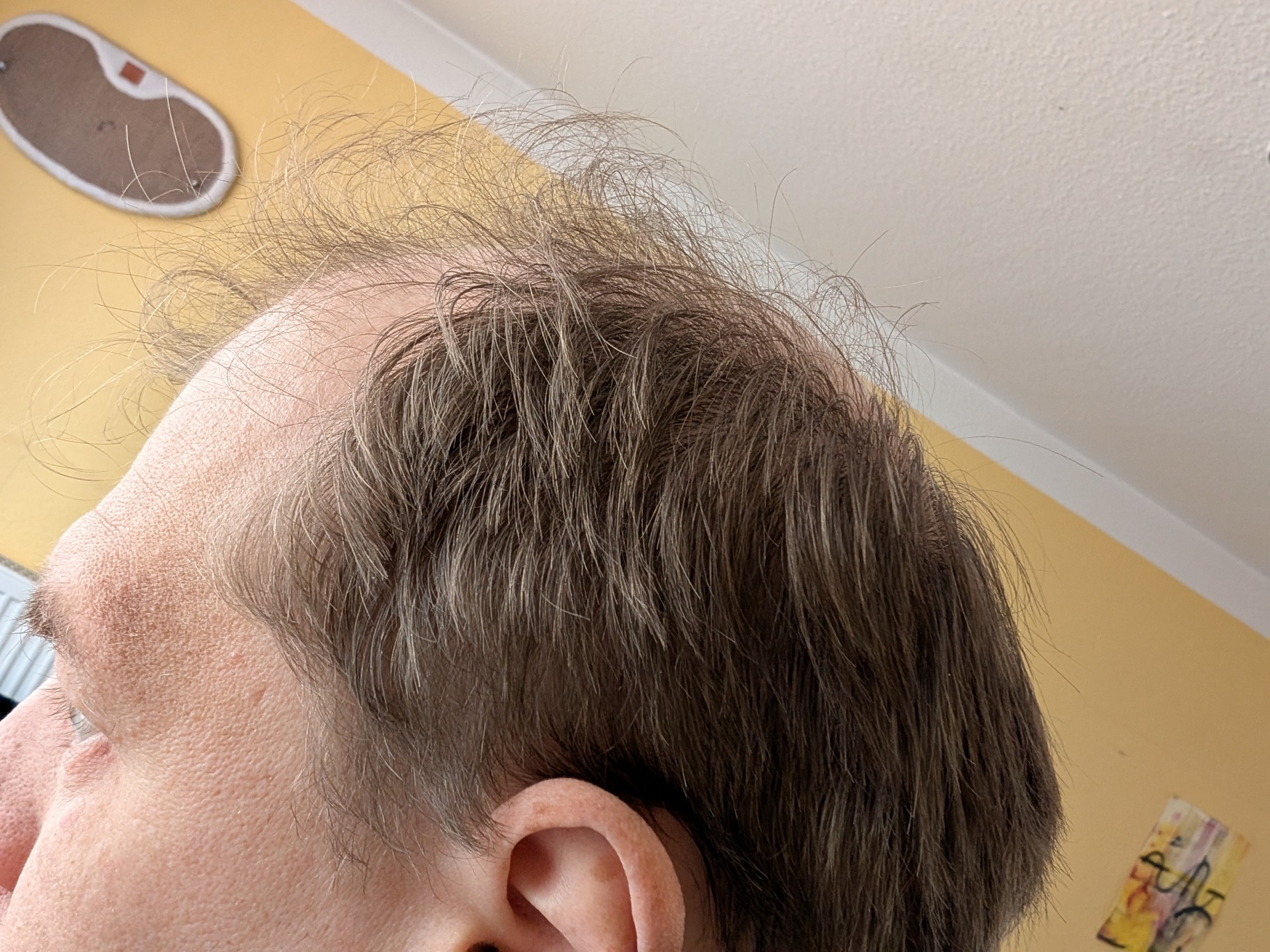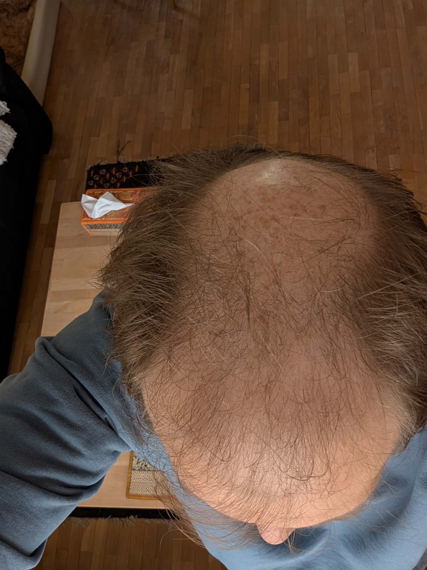 * Aktueller Haarstatus nach der Hamilton-Norwood-Skala: am ehesten wohl 5, wobei einzelne Haare gerade im Frontbereich noch da sind
