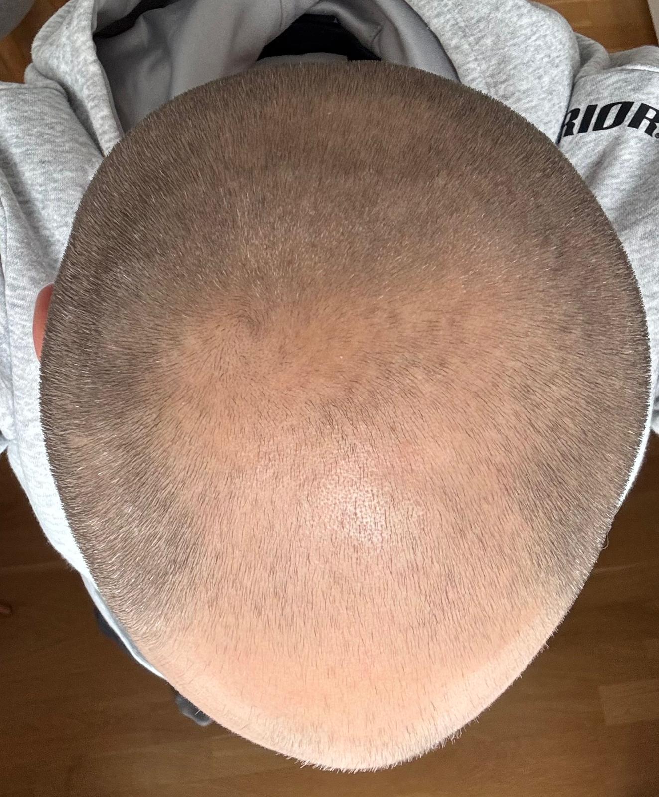 Meine persönliche Einschätzung meiner Haare in Worten: oben ist es sehr sehr dünn. Vorne stehen noch ein paar Haare, dahinter ein ordentlicher Streifen ohne Haare. Seiten und Hinterkopf eher stabil und voll. Haare grundsätzlich eher kräftig.