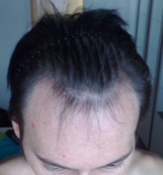 Anbei noch 2 Bilder (leider etwas unscharf, da ich nur eine Kamera im Handy habe), wie meine Front momentan aussieht. Der Rest der Haare wirkt, wie schon erwaehnt, ziemlich dicht. Trage die Haare auch recht lang und bis auf das fehlende Volumen in Front sieht das auch ganz passabel aus.