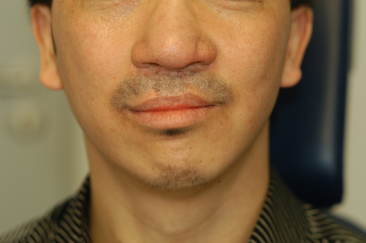 Man kann in Bartbereich auch Kopfhaare transplantieren...müssen nicht unbedingt Körperhaare sein. Das Problem mit BHT (Body hair Transplantation) ist dass die Anwuchsraten trivial sind...manchmal gut, manchmal schlecht. Dazu kommt der Fakt dass die Anwuchsraten in Narbegewebe auch etwas geringer sein können als in normale Haut. Ausserdem können die Körperhaare etwa zu dünn sein (aber das ist natürlich unterschiedlich). Anbei ein Bild 7 Monate nach einer Haartransplantation in Oberlippenbart Bereich (in einer Narbe ungefähr 120 FU's). Vorher Bilder habe ich leider nicht dabei (bin jetzt in Schaffhausen...kann erst am Montag hochladen)