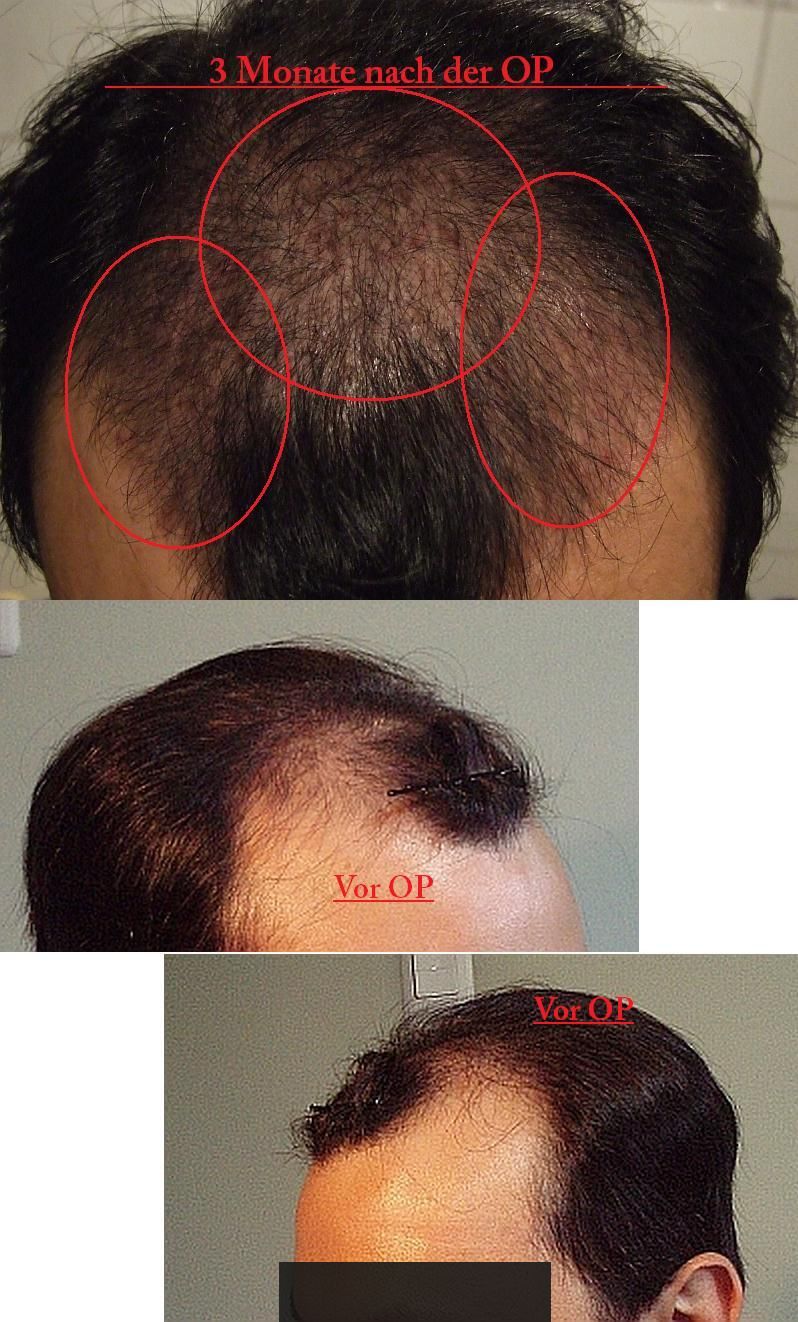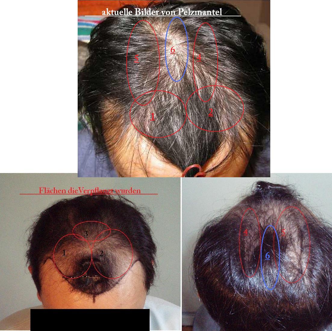Wie durch Ihre aktuellen Bilder erkennbar ist, ist Ihr Haarausfall in den vergangen 2 Jahren leider voran geschritten. Eine Garantie, das Sie nach einer Behandlung, keinen Haarausfall mehr bekommen könnten, kann Ihnen kein Arzt dieser Welt erteilen. (Feld 6 auf dem Bild vor der Op und aktuelles Bild nach 2 Jahren)