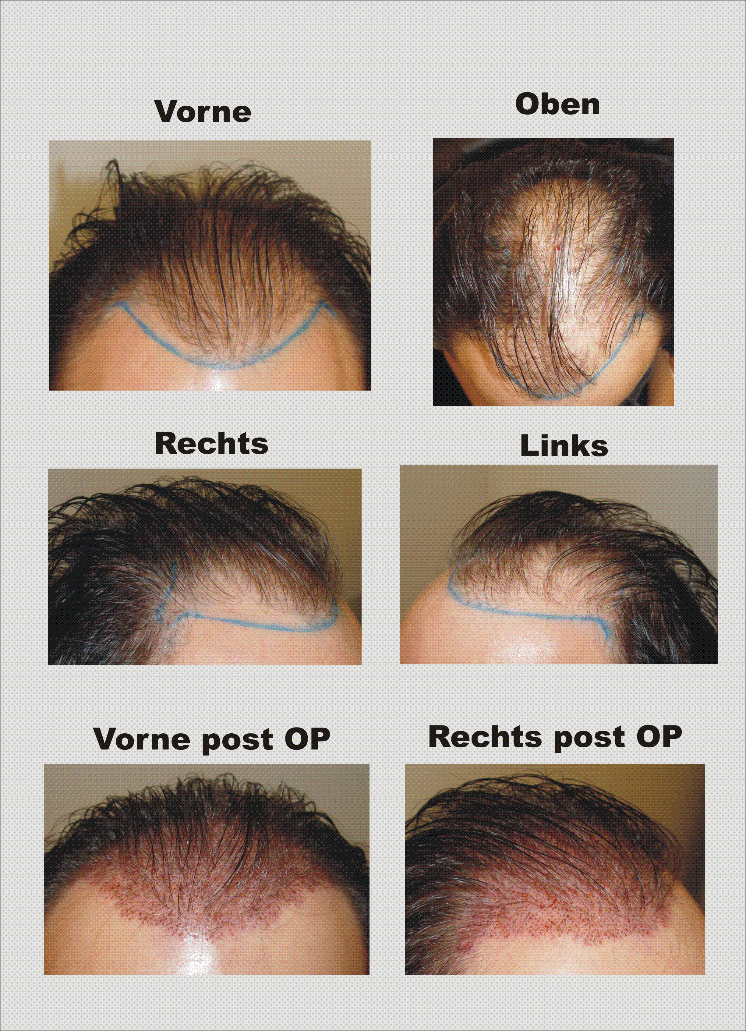 Die schöne Zeit beginnt dann nach ungefähr 4 Monaten, wenn alte und neue Haare so richtig zu wachsen beginnen und nach und nach auch sichtbar werden. Nach ungefähr 5 Monaten war mein Haarstatus endlich wieder ähnlich wie vor der HT, jetzt nach 6 Monaten bin ich mit dem Zwischenergebnis schon einigermaßen zufrieden, obwohl ich mir von den nächsten 4-6 Monaten doch noch einiges erwarte. Auf den Fotos („6monate“) seht Ihr, dass die Haarlinie bewusst konservativ (relativ hoch) gewählt wurde und durch das Setzen von Single-Grafts und einen relativ „weichen“ Übergang sehr natürlich aussieht. Anhand der vereinzelten Haare ganz vorne (die ich mir nun bald abrasieren werde) könnt ihr erkennen, wie meine Haardichte ohne HTs aussehen würde... Auf dem Bild von oben sieht man, wie die Dichte nach hinten abnehmend gesetzt wurde. Meine Ausgangssituation vor und kurz nach der Behandlung seht ihr auf den Fotos in „before“.