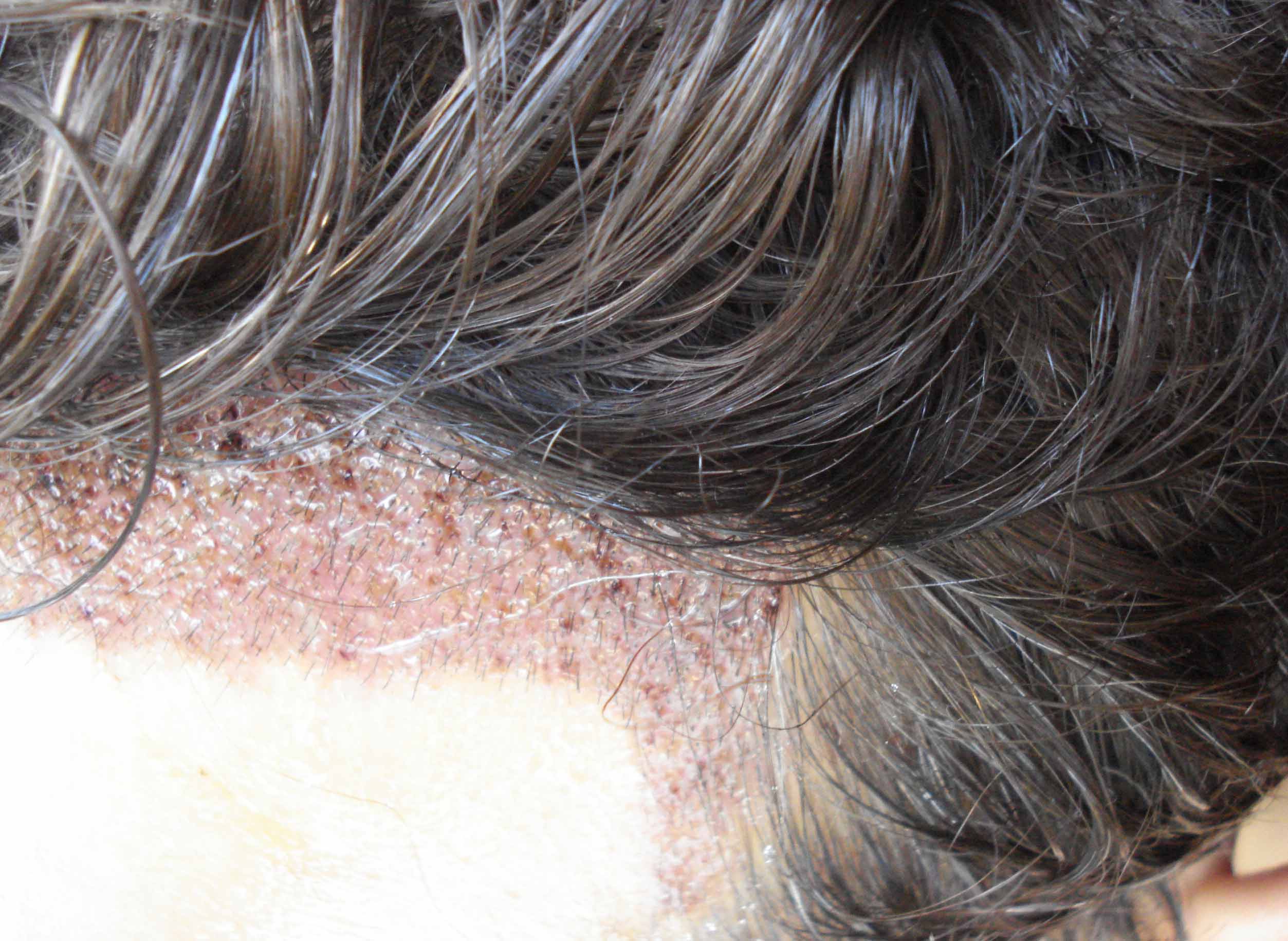 Bei dieser OP wurden aufgrund der höheren Dichte viel mehr Hautverletzungen produziert als bei OP 1 - d.h. es ist potentiell mehr "Angriffsfläche" für das Propylenglykol (der Stoff in Regaine, der hauptsächlich die Hautreizungen verursacht)da.