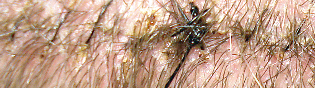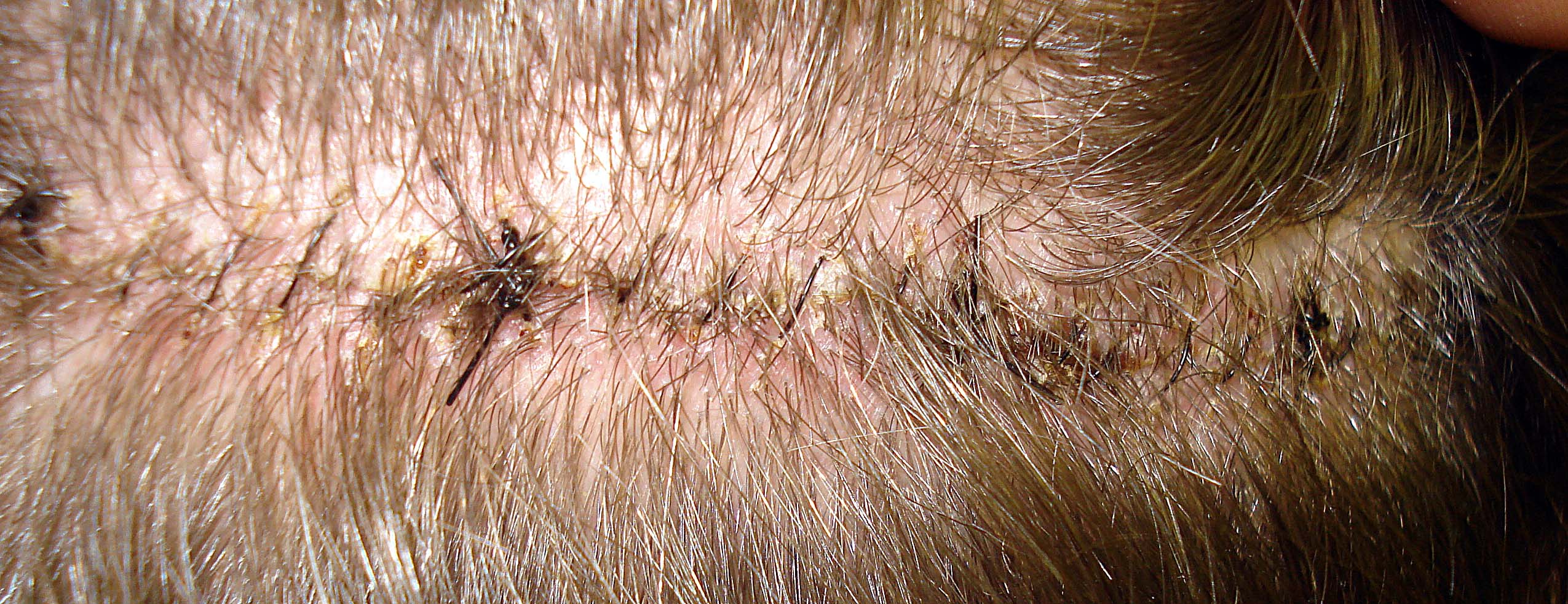 6 Tage post OP, Narbe stark gezoomt. Haare weitgehend rausgekämmt, voll reingeblitzt, deshalb der freie Blick auf die Kopfhaut. Kann irgendjemand noch die Nahtstelle erkennen? Hoffentlich geht das so weiter...