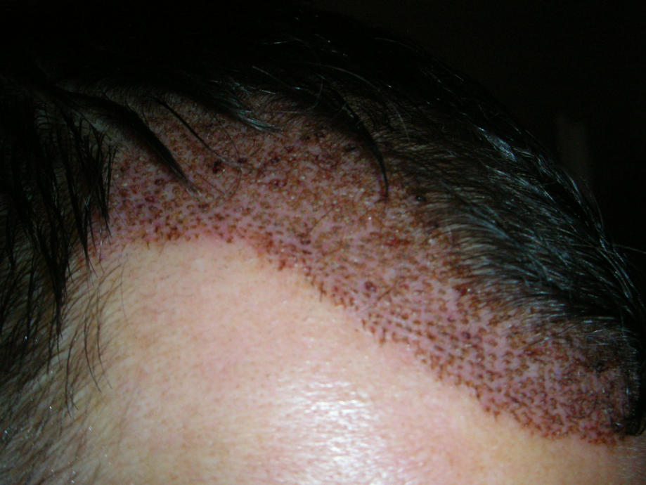 Vorne wurde ziemlich weit in bestehendes behaartes Areal (tw. abrasiert) nach hinten reingepflanzt bzw. ist die Frage wieviele Multis da hinter der Haarlinie(ganz vorne) gesetzt wurden.