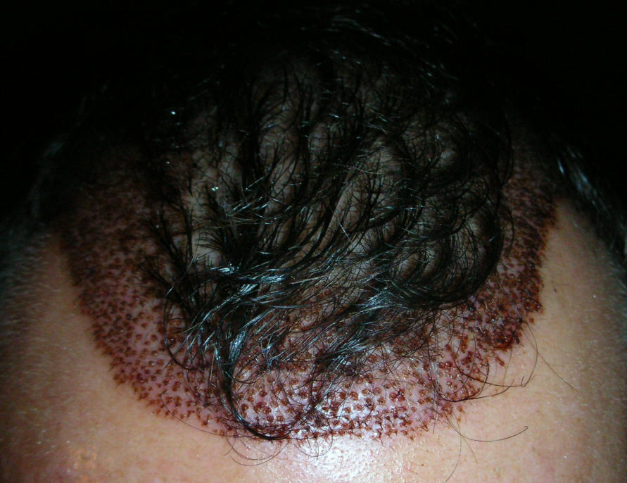 Die Haare sind ca. 3-4mm lang, mit Blitzlicht bzw. im Neonlicht vor dem Spiegel sind da und dort natürlich kleine rote Punkte ausmachbar, ansonsten renne ich seit 7 Tagen relativ "frei" herum und niemandem ist da was aufgefallen (nur die Rötung im Empfangsbereich - Sonnenbrand Cool ) - der Donor scheint also bereits halbwegs alltagstauglich zu sein Smile