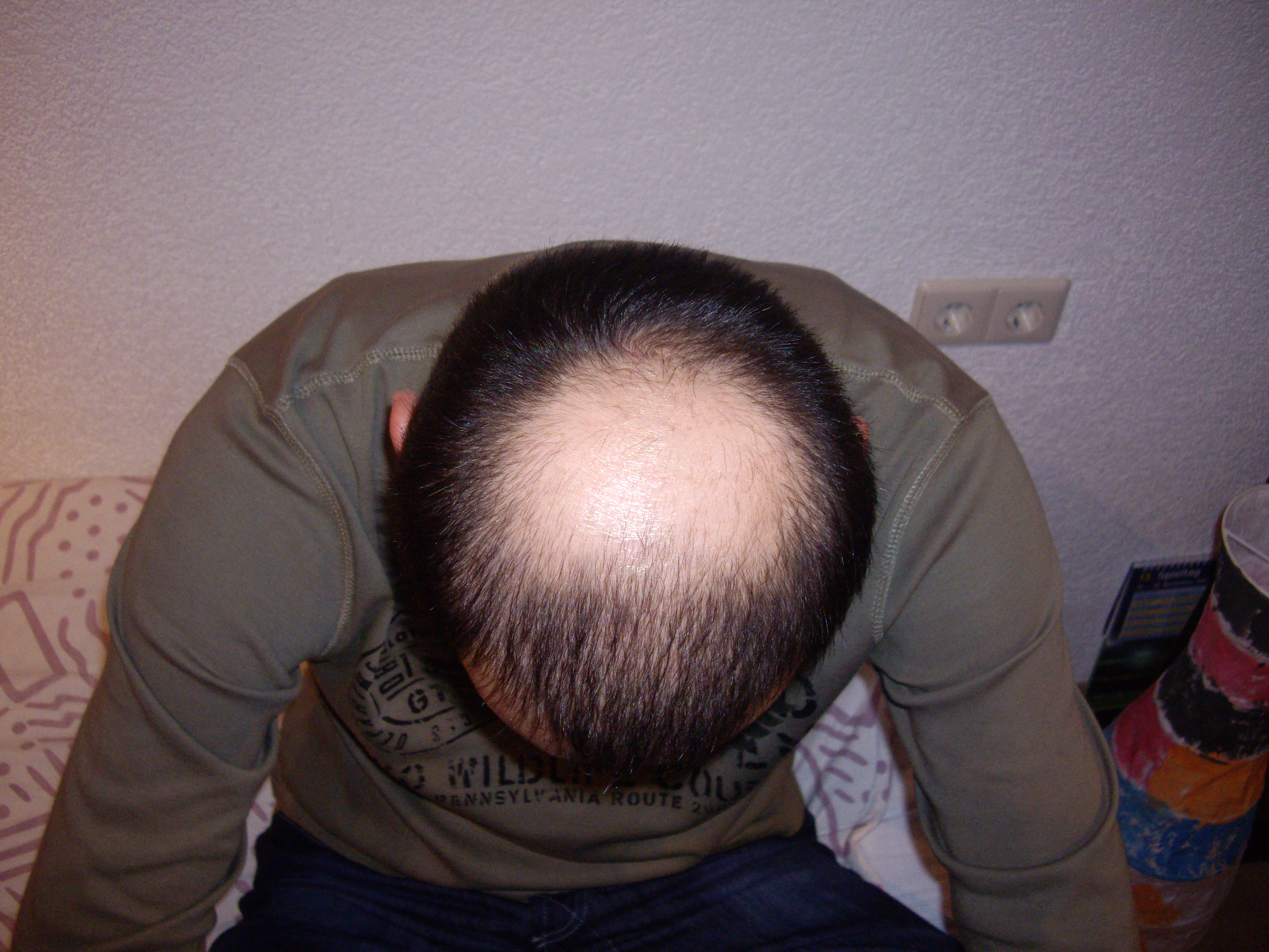 Zur meiner situation:ich weis nicht genau wann der ausfall bei mir begonnen hatt(denke anfang 20).Momentan habe ich eine Tonsur glatze.Vom haaransatz biss zur mitteist es schütter.Der ausfall ist aber seit einem jahr fast vorbei,da ich mein haarstatus jeden tag verfolge.