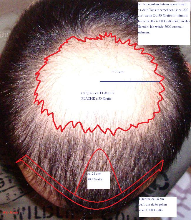 ich habe Dir eine optimale(Maximum!!!) Planung gezeichnet. Meine Haarplanung ist ähnlich, bei mir ist aber mit viel Erfahrung und Stepp by Stepp erfolgt. Dieser Plan ist aber abhängig vom deinen Donorreserven. Bedenke dabei, dass ich diese Planung nur mit 2 Bildern (man bräuchte mehrere Bilder aus unterschiedlichen Perspektiven, HL etc.) ohne Dich gesehen zu haben erstellt habe. Also dein Tonsur und teilen vom Zone 3 laut meine Rechung ca. 200 cm². Ich würde jetzt alle meine Reserven nicht drauf ballern.