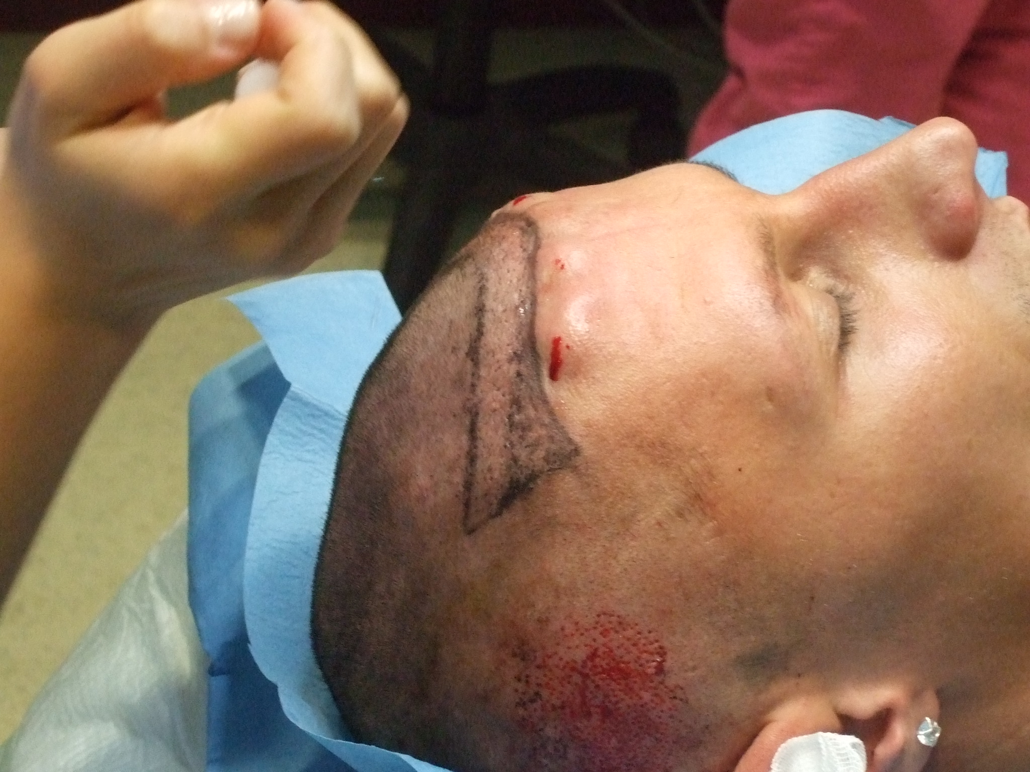 Nach dem Essen fing nun die Verpflanzung der grafts an. Zuerst wurden die Empfangslöcher mit einer sehr dünnen Klinge aufgeschlitzt und danach wurden die Grafts eingesetzt. zuerst wurden die einzelnen Haargrafts eingesetzt und dann die mit mehreren Haaren. Damit ich mich vergewissern konnte das es auch so gemacht wurde, schoß Mehmet mehrere Bilder damit ich es mir anschauen konnte. Schon Kraß wie einem der kopf aussieht bei einer Behandlung.Ich mußte an den Film saw denken.