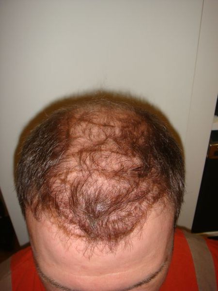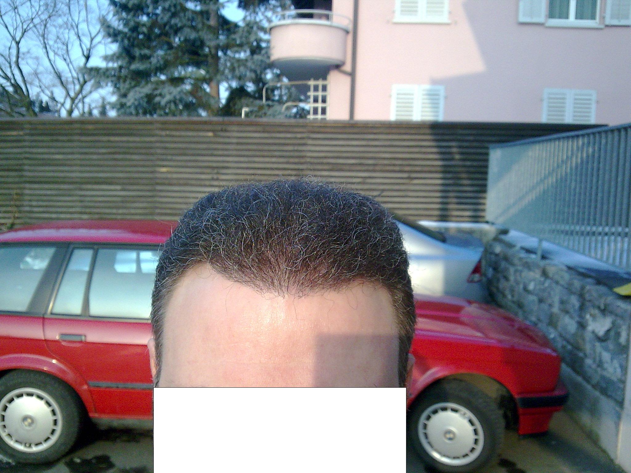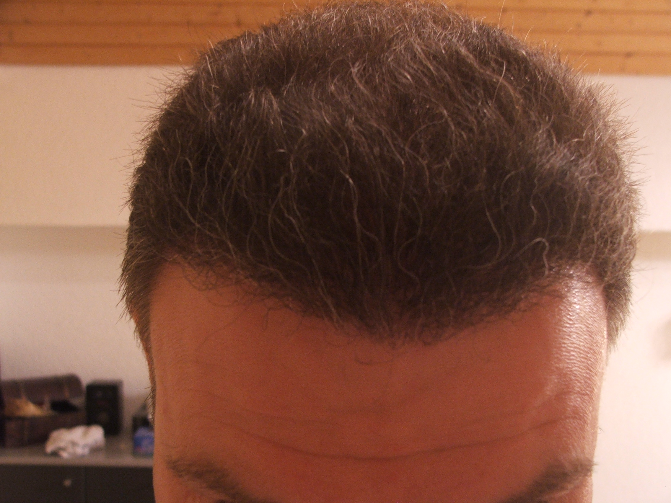 Ich bin auch sehr zufrieden bisher. Nur die Tonsur ist schon noch licht, aber ich hoffe, dort tut sich auch noch ein bisschen was. Auf dem dritten Bild kann man das gut erkennen. Ich kann jedoch dort noch viele Stoppeln spüren (Ich hoffe, ich bilde mir das nicht ein), und es wurde dort natürlich auch weniger Dicht gearbeitet, da das Hauptaugenmerk auf der Wiederherstellung des vorderen Bereichs lag.