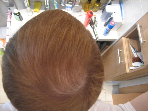 Das wäre so ungefähr wie bei mir in der Front. Die Eckengröße und die Mitte kommt auch ungefähr hin. Im grunde hab ich das selbe wie du vor,nur das ich vorn anfange und die Tonsur veruche mit Medikamenten zu retten.