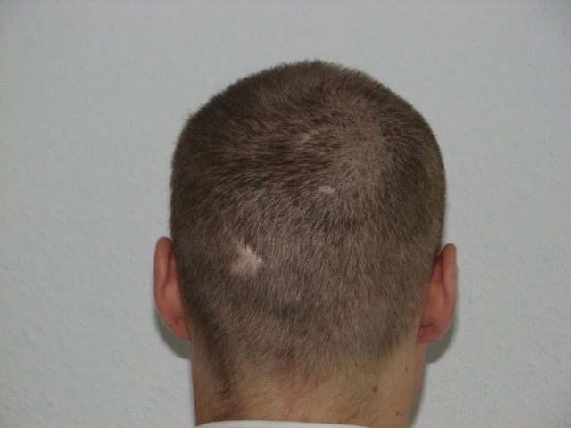 tag 12. alle krusten sind ab. es sieht gut bis sehr gut aus. und das bei meiner erwartungshaltung. ich denke, es ist ein kleines bisschen dünner als bei jemandem, der nie haarausfall hatte und sich kurze haare macht. noch sind nicht alle haare gleich lang, weswegen es wohl auch noch nicht so aussieht, wie es aussehen könnte.