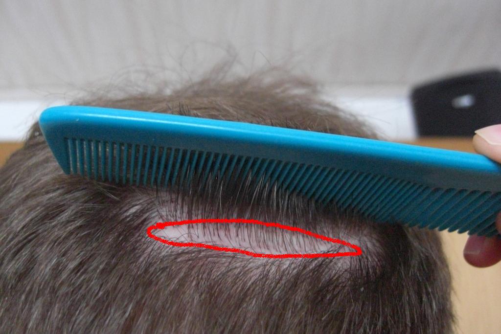 3) Im Vergleich zum narben-umliegenden Haar, ist genau dieser (rot markierte) Narbenbereich definitiv dünn besiedelt. Warum? Sieht mir nämlich doch nach einer breiteren Fläche aus - oder ich spinne komplett.