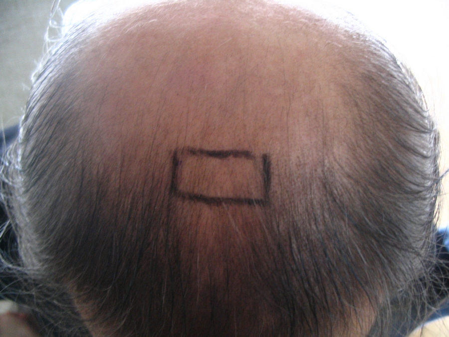 Bei diesem Patienten wurde zuerst ein BHT-Test mit 15 Bart-Grafts durchgeführt um zu schauen wie sich die Anwuchsrate verhält, damit man wissen konnte ob für die Tonsur eine BHT in Frage kommt.